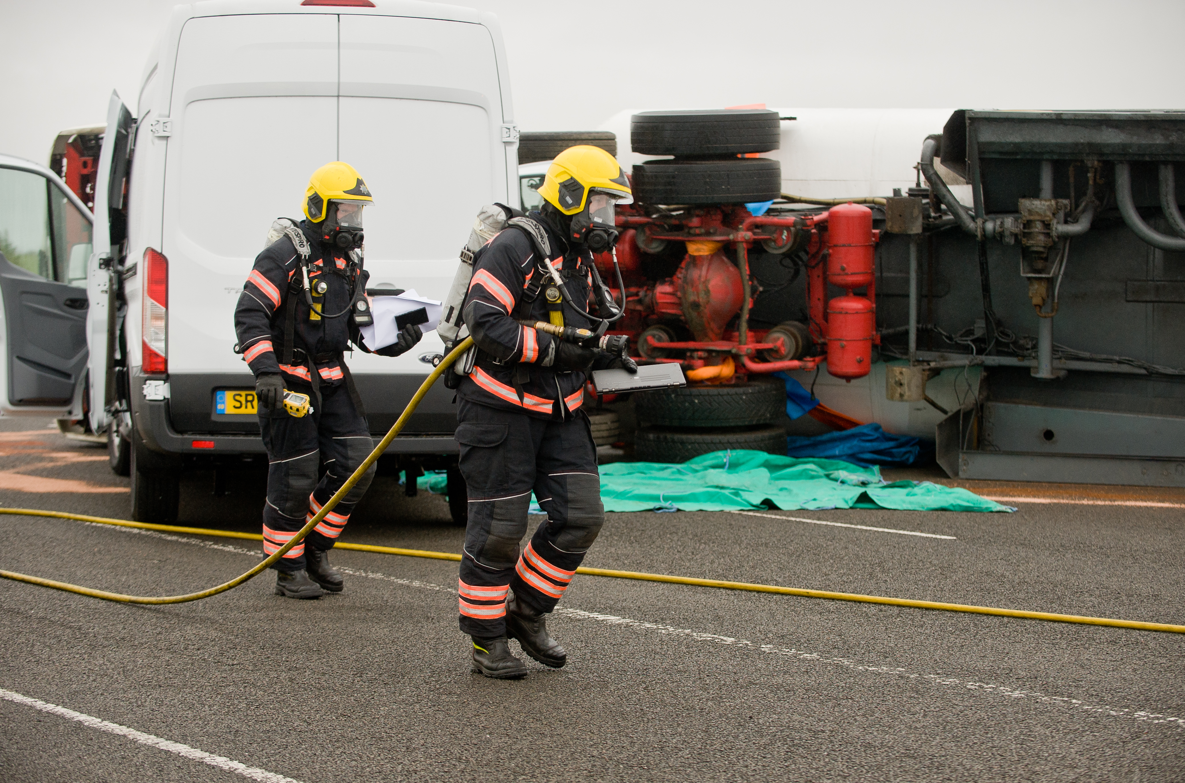 ? Si Barber 07739 472 922 Cambridge constabulary, firefighters and emergency services conducting an exercise of dealing with a chemical accident and spillage. Picture shows: Firefighters with breathing apparatus approaching the vehicle.