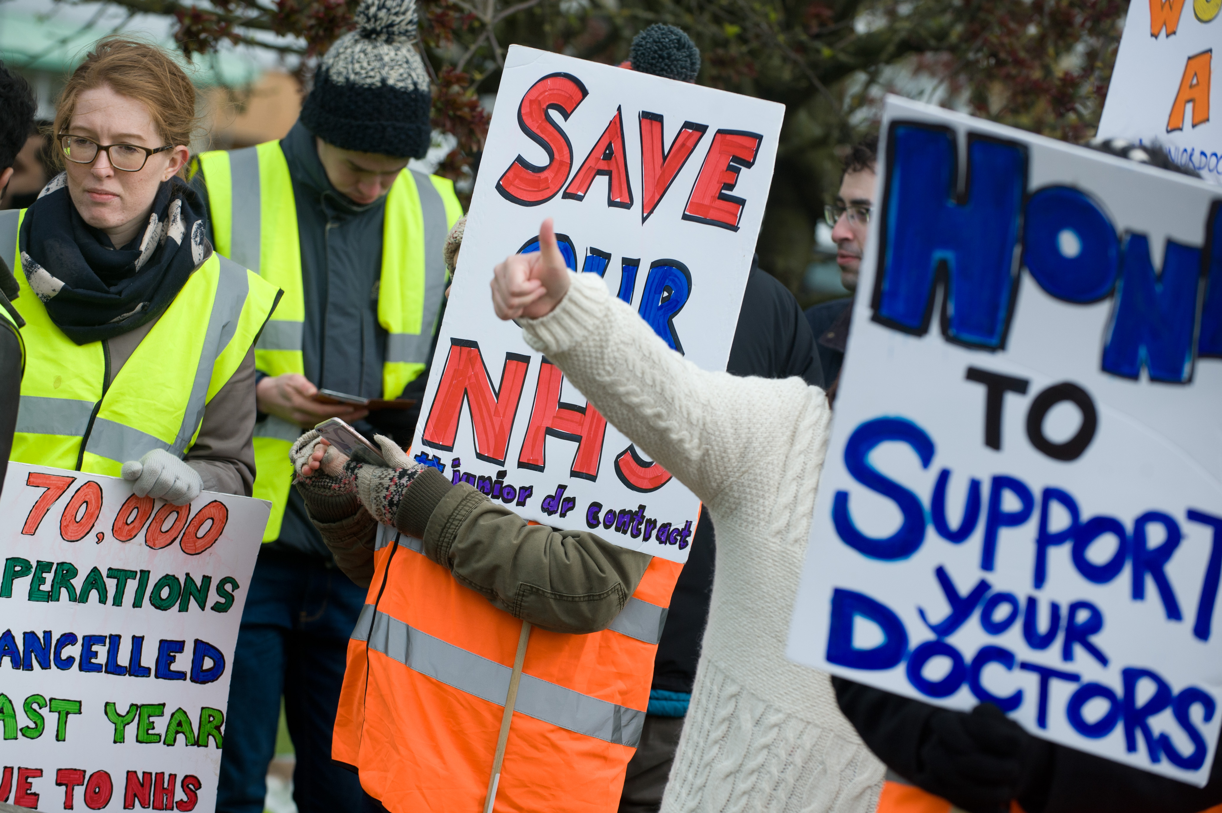 Doctor's protesting outside the Queen Elizabeth Hospital, Kings Lynn, Norfolk on the first day of their first ever strike, 26th April 2016.