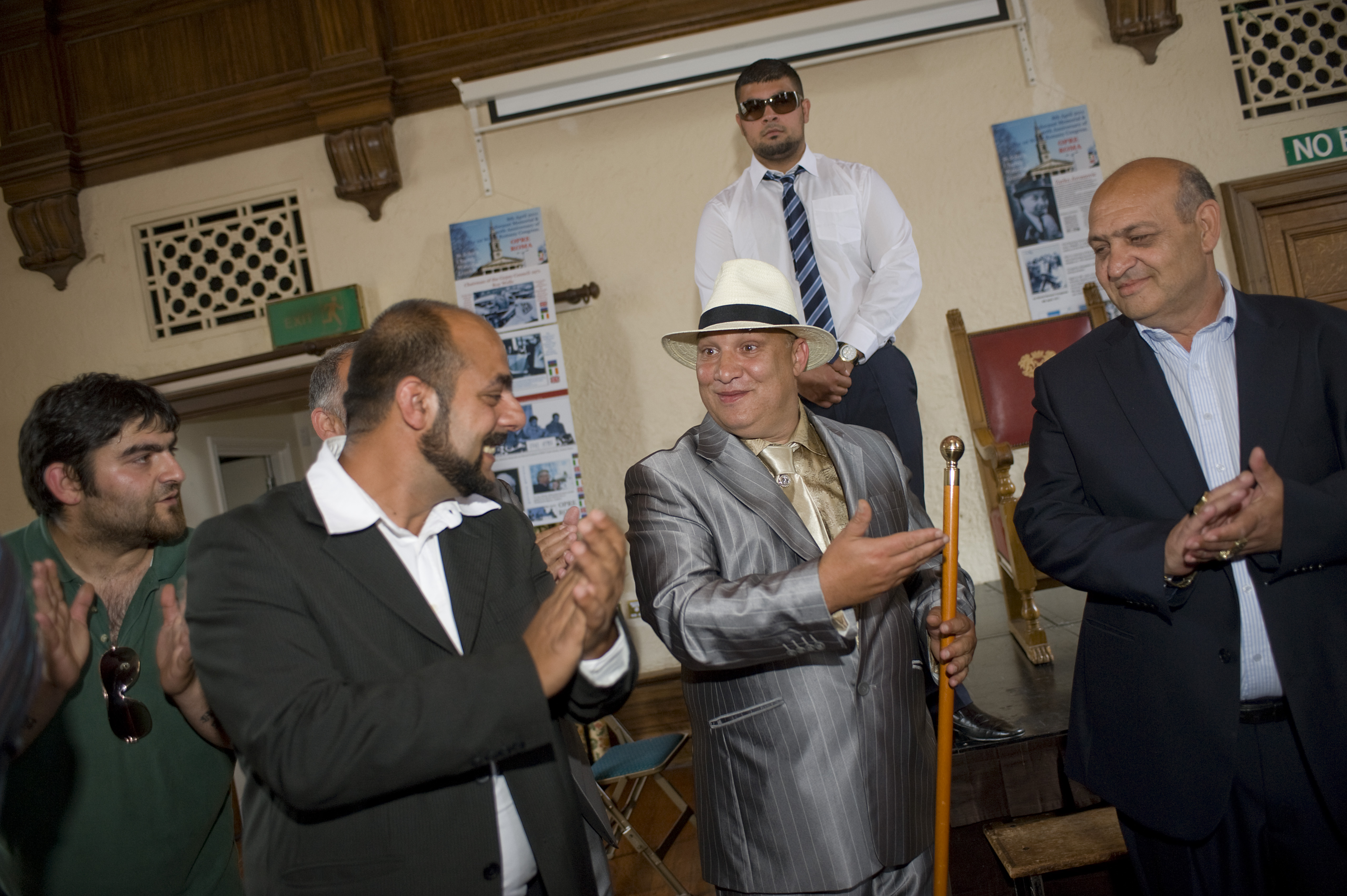 ?Si Barber2010 Tel 07739472922.Voting in the UK's first ever Roma Gypsy election gets under way in Peterborough, Cambridgeshire on Saturday 25th June 2011..Nineteen candidates from across Britain have been ?campaigning ?for the title of 'King of the Gypsies, which in past years was decided with a fist-fight but today the winner will be nominated by the ballot box. ?The victor will be awarded a crown and a 'gold' stick which will empower them to adjudicate on disputes within the community. In this picture?each candidate pays respect to the other before the victor is announced..