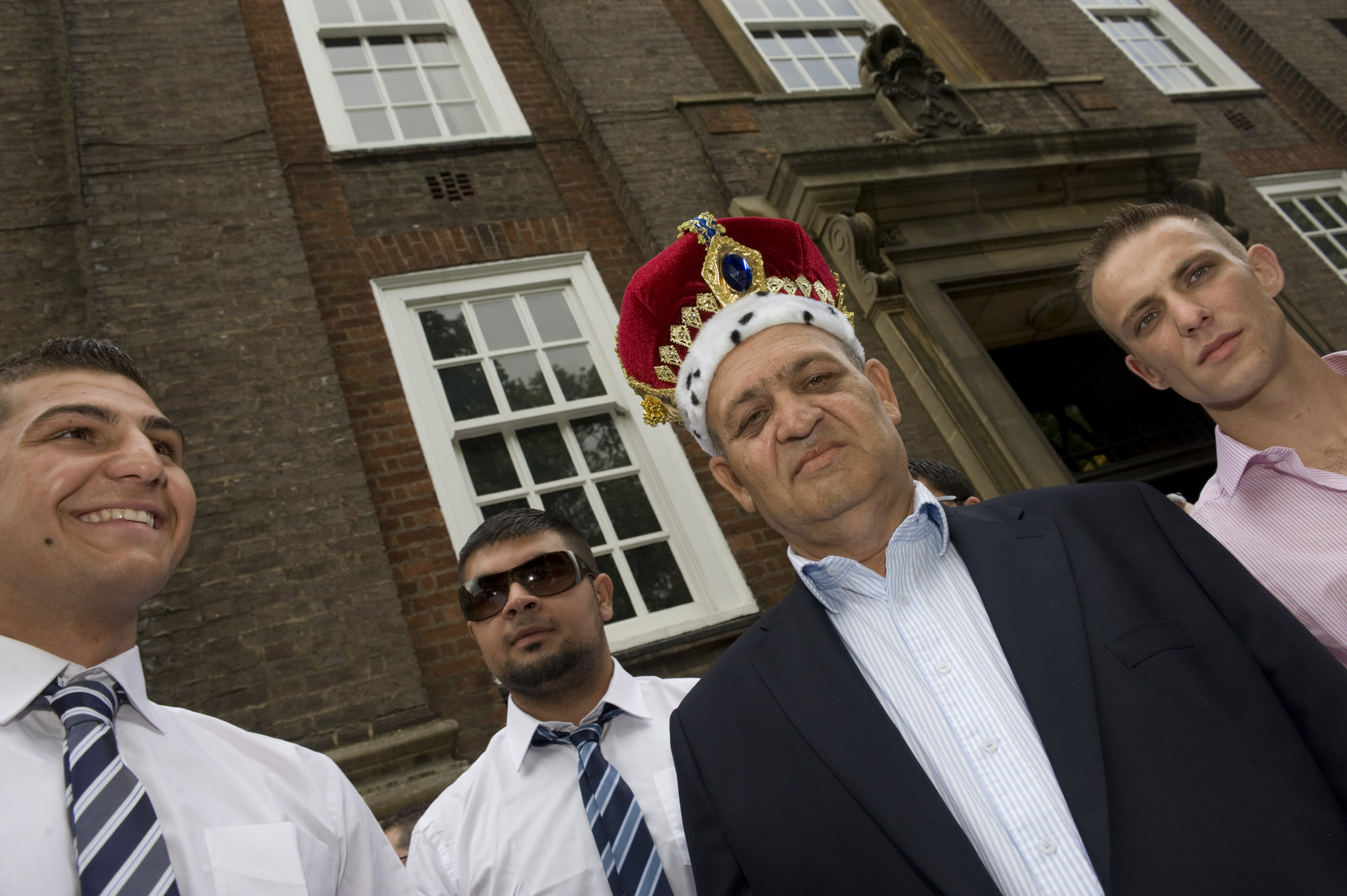 ?Si Barber2010 Tel 07739472922.Voting in the UK's first ever Roma Gypsy election gets under way in Peterborough, Cambridgeshire on Saturday 25th June 2011..Nineteen candidates from across Britain have been ?campaigning ?for the title of 'King of the Gypsies, which in past years was decided with a fist-fight but today the winner will be nominated by the ballot box. ?The victor will be awarded a crown and a 'gold' stick which will empower them to adjudicate on disputes within the community. In this picture?amid security and well-wishers ladislav Stojka leaves victorius as King of the Gypsies..