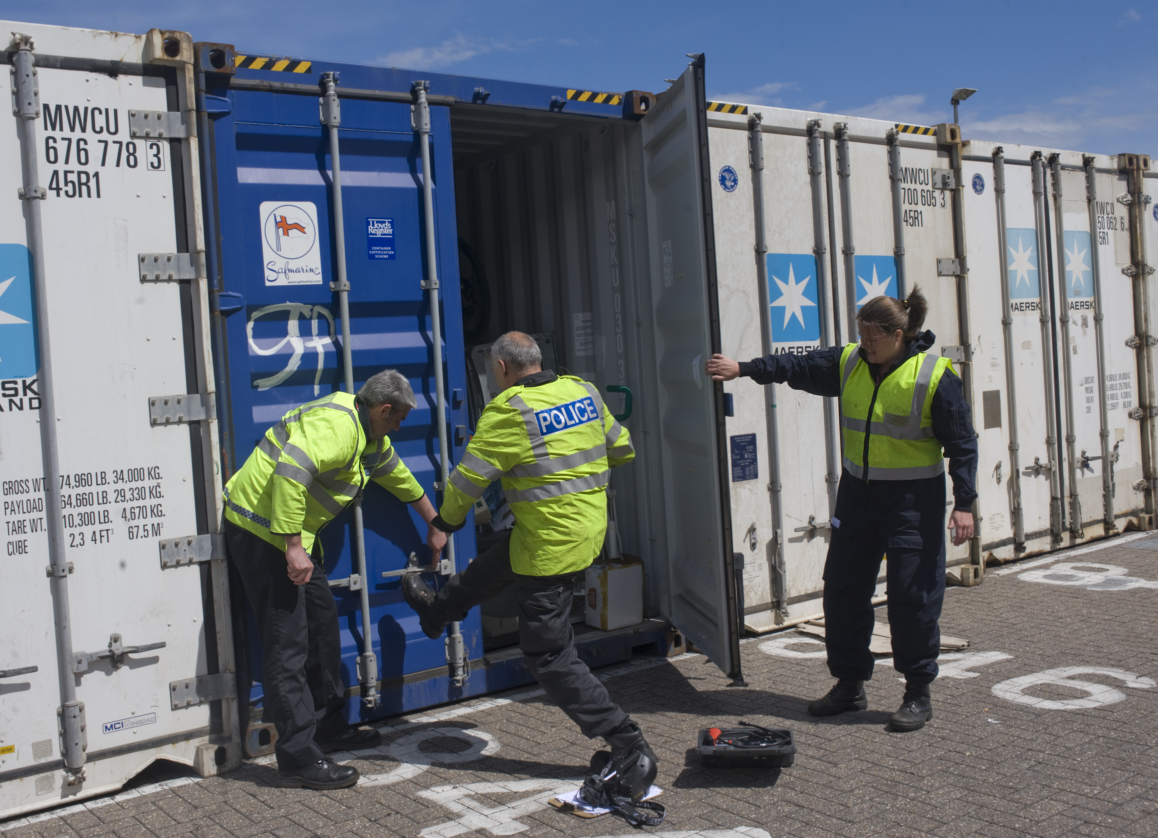 Police officers searching containers at Felixstowe port in Suffolk for stolen goods and contraband.