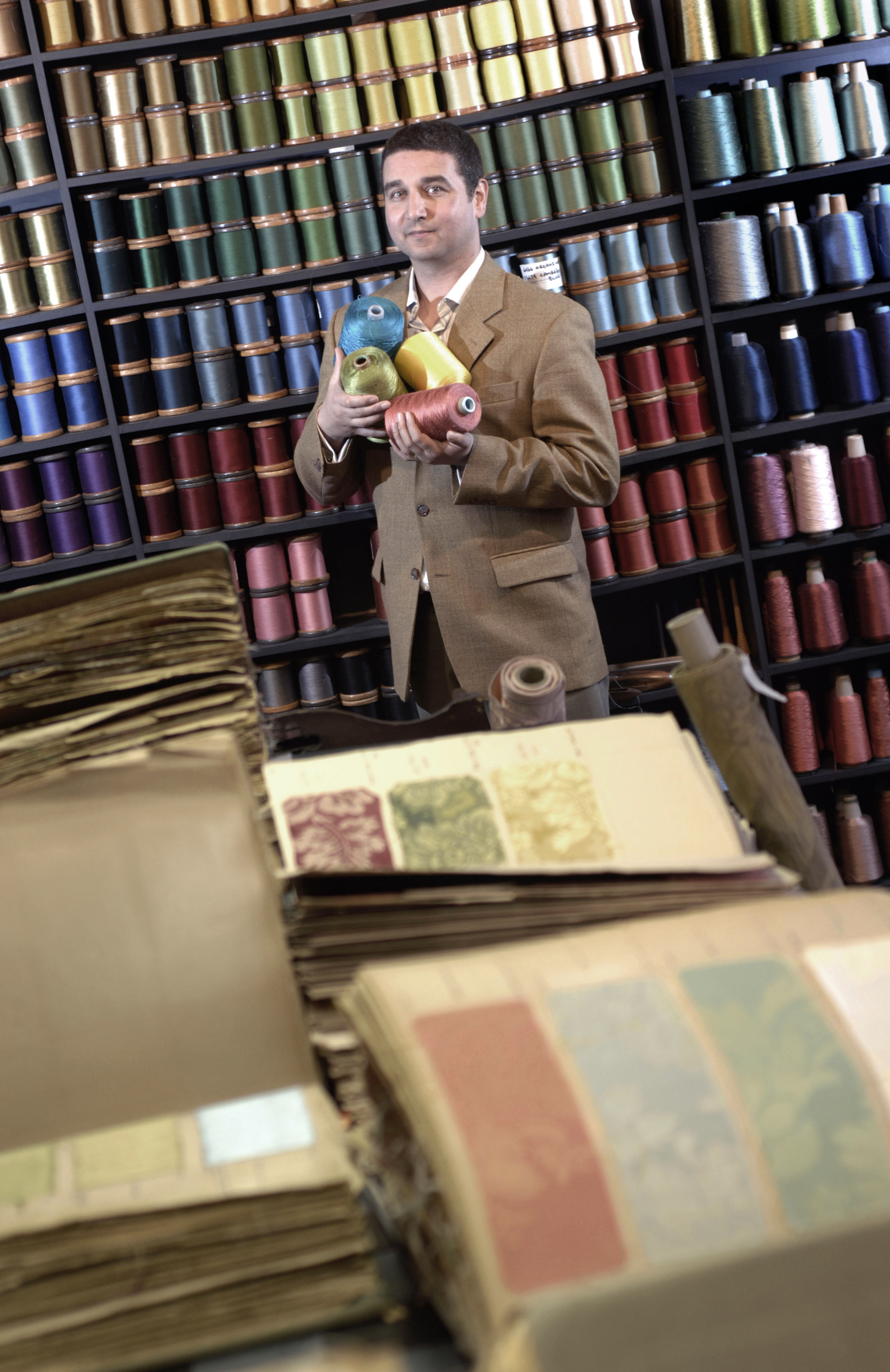 Pic by Si Barber - 07739 472 922 Neil Thomas of Gainsborough Silk Weavers in the samples room of his factory at Sudbury, Suffolk. Ordered by Katie Litchfield. 220307