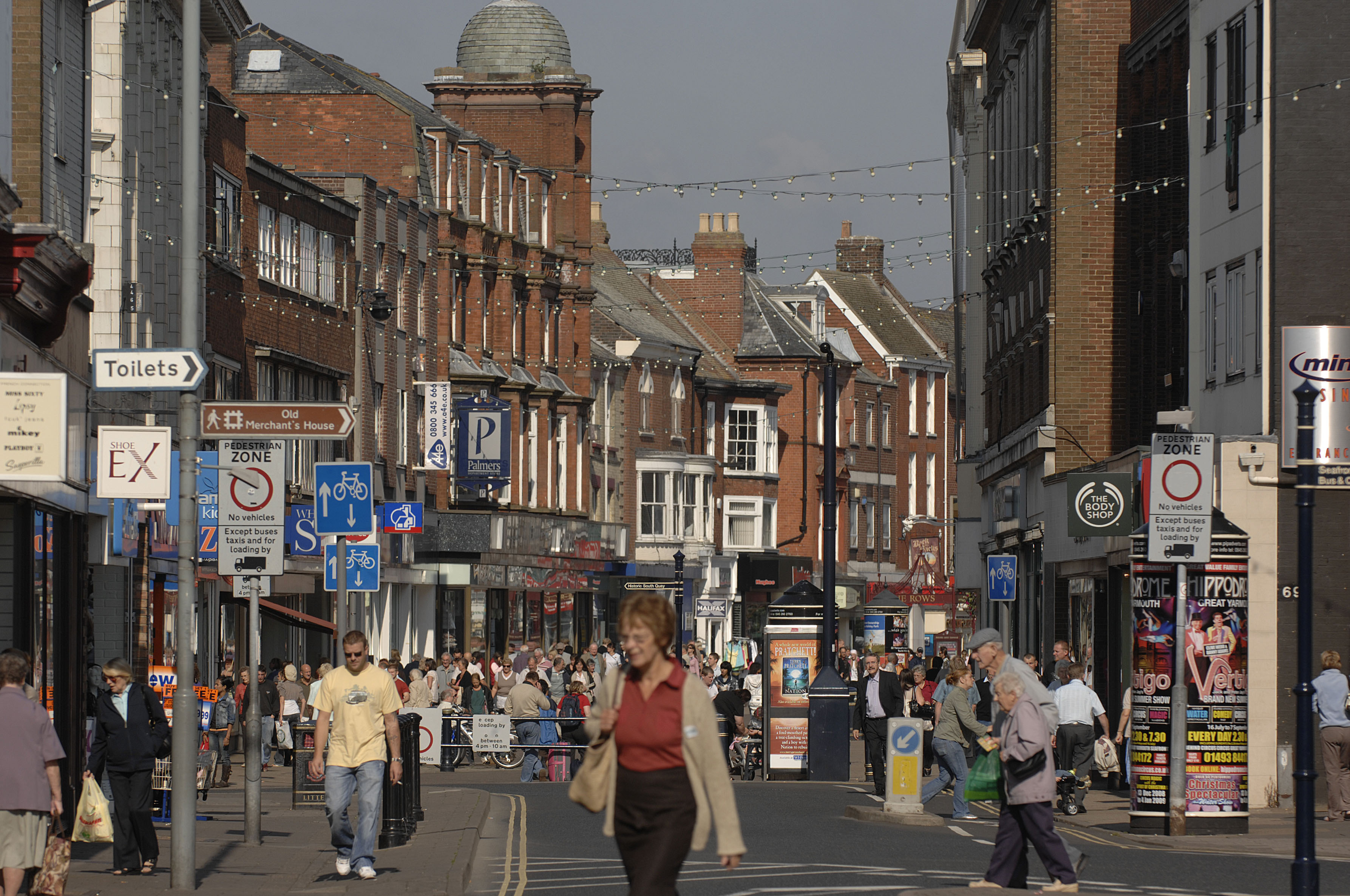 Great Yarmouth in Norfolk. Pic shows Market with buildings of mixed architectural styles in the background.