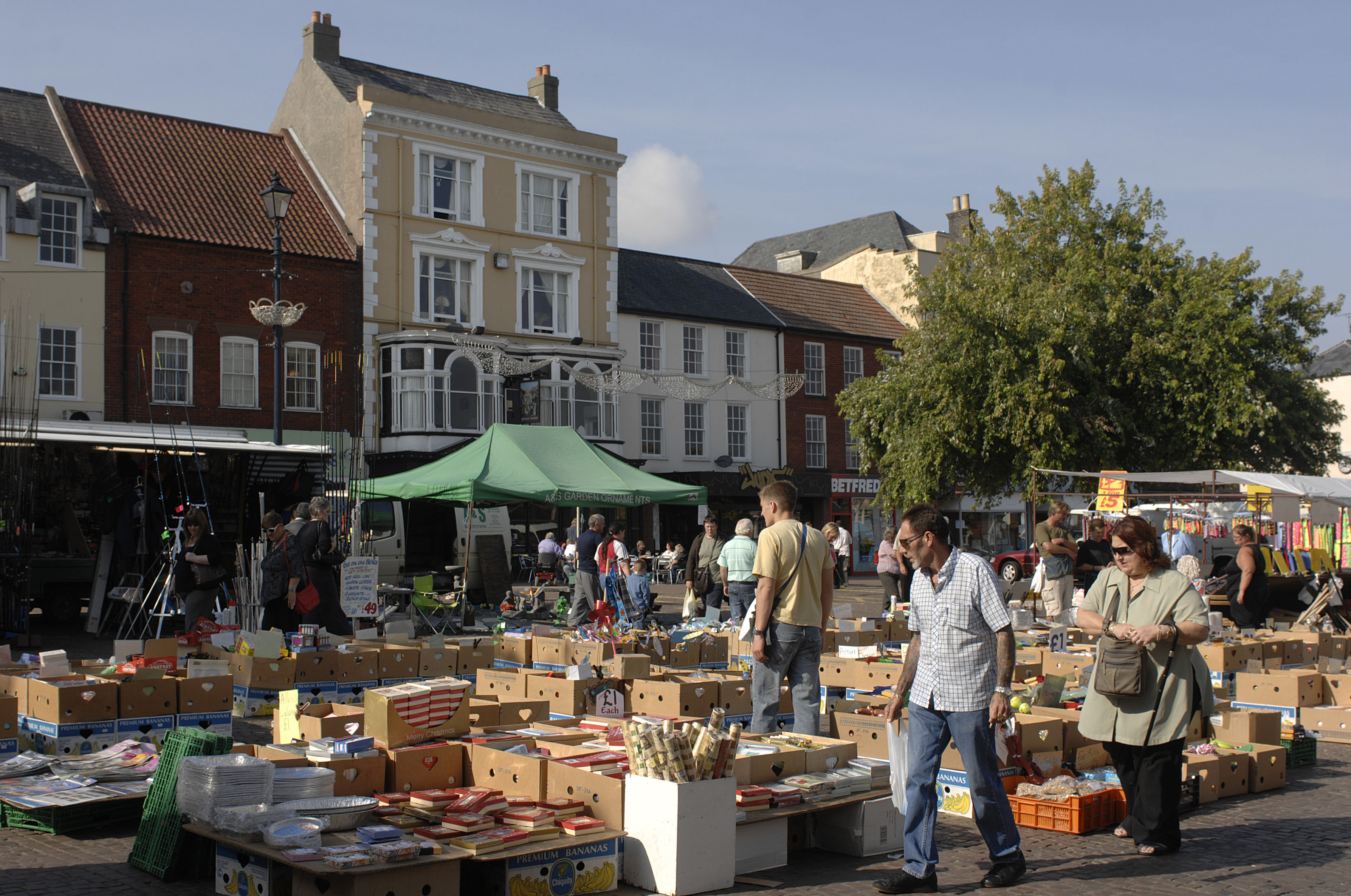 Great Yarmouth in Norfolk. Pic shows Market with buildings of mixed architectural styles in the background.