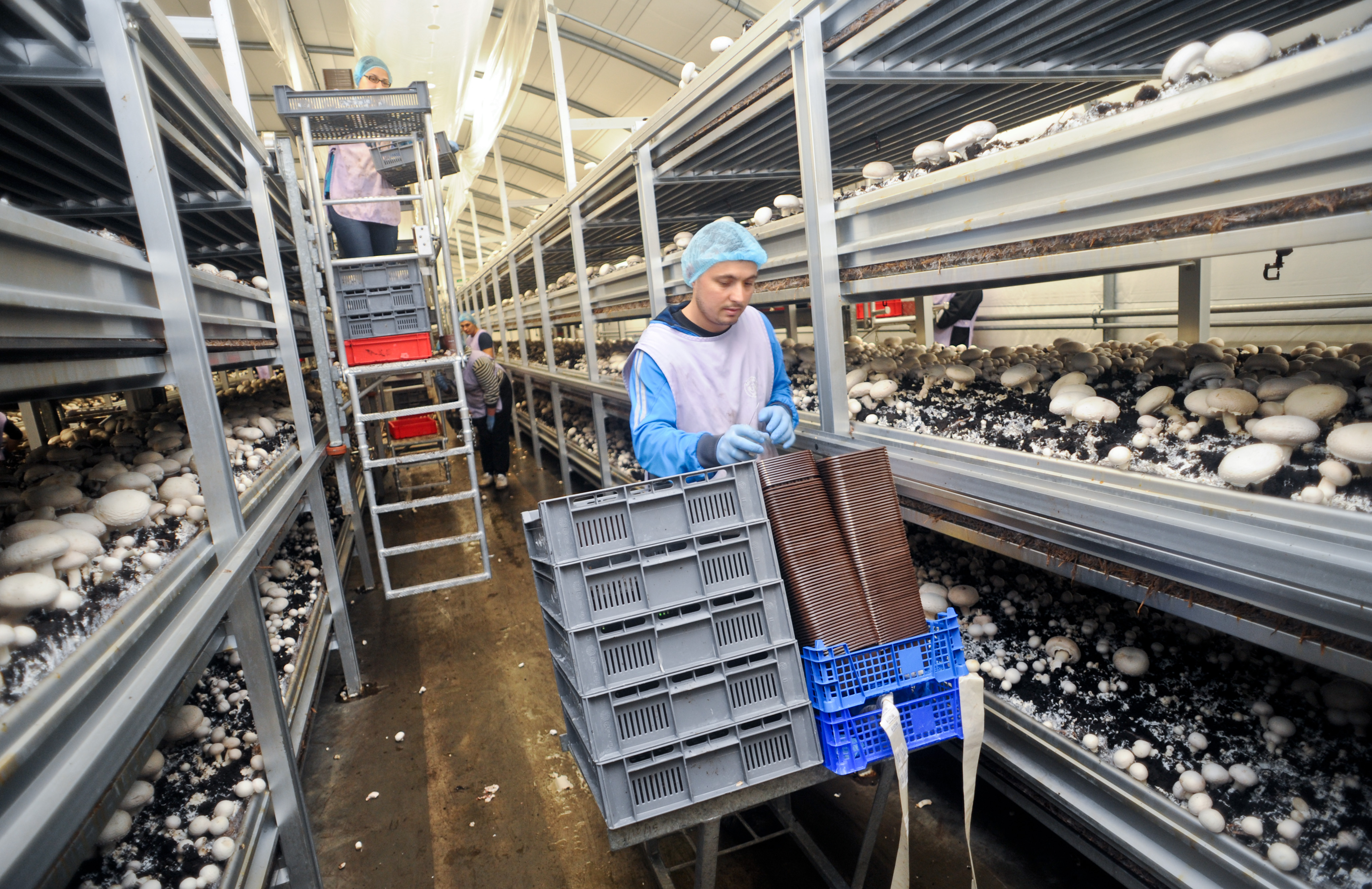 G's vegetable growers near Ely in Cambridgeshire. The company employs and provides accommodation and facilities for many workers from Eastern Europe. Picture shows - Mushroom growing and processing.