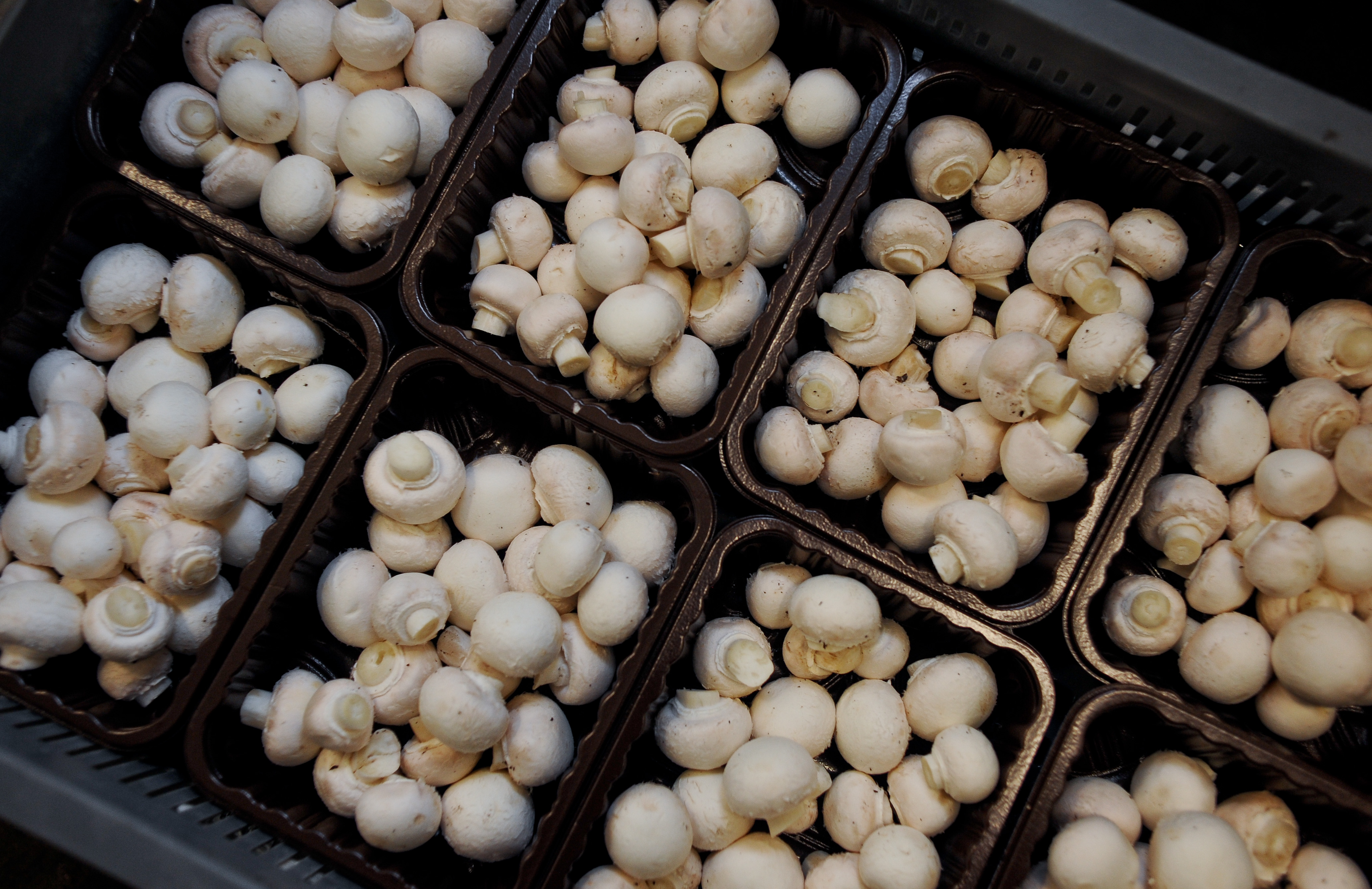 G's vegetable growers near Ely in Cambridgeshire. The company employs and provides accommodation and facilities for many workers from Eastern Europe. Picture shows - Mushroom growing and processing.