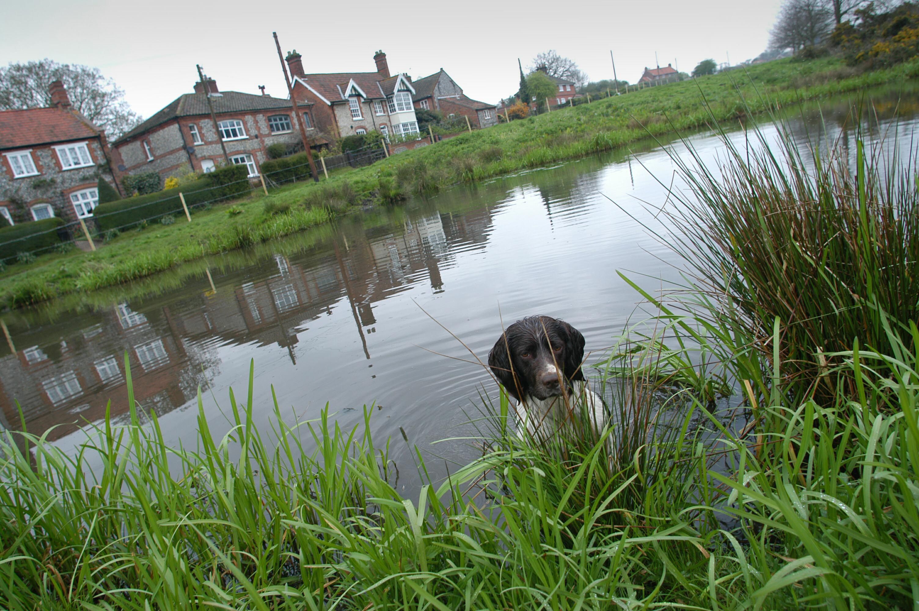Pic shows Tilly, the springer spaniel in the duckpond on the green.