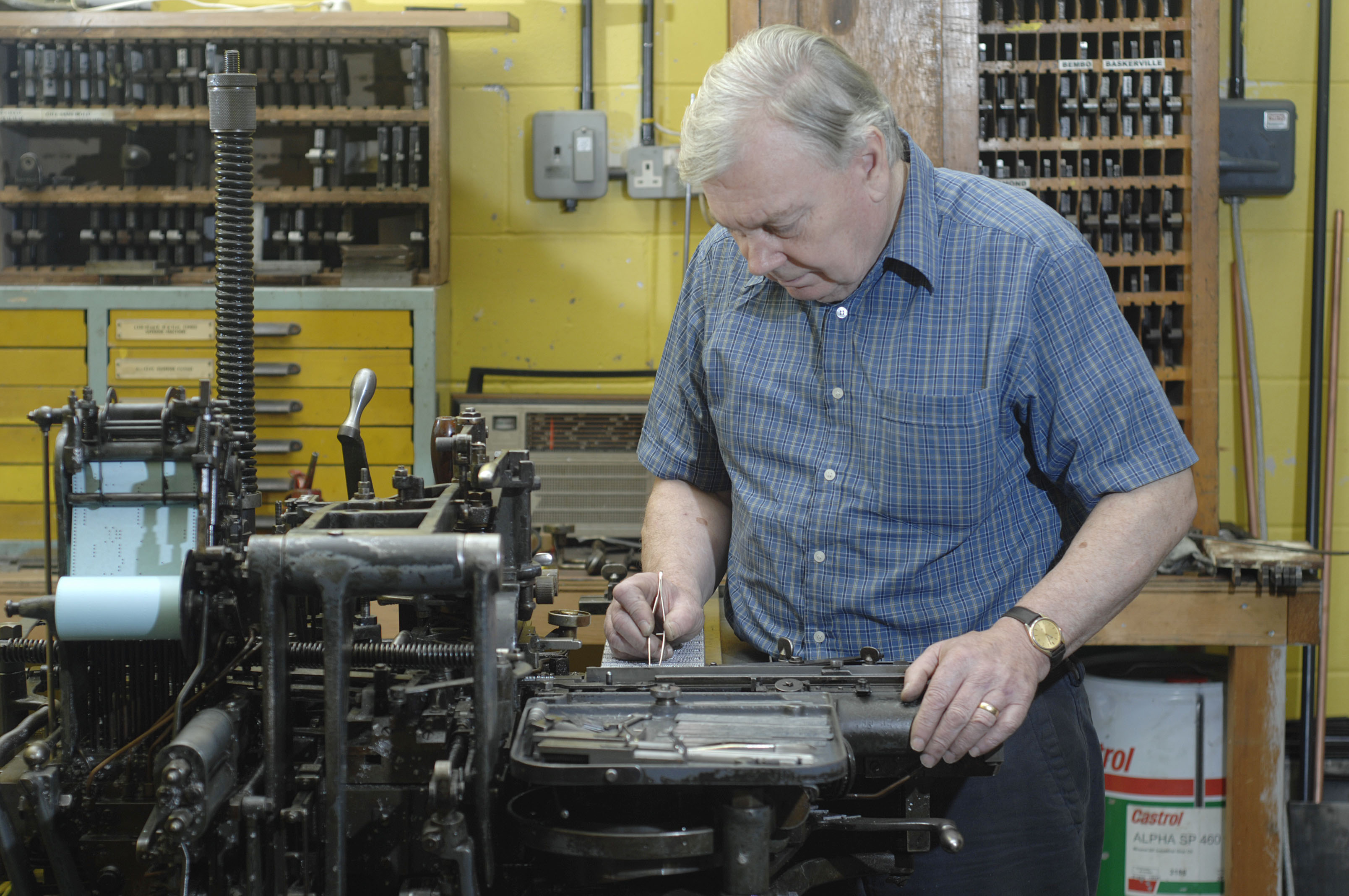 Pic by Si Barber - 07739 472 922 Traditional printer Brian Hubbard with 'hot metal' lead type, North Walsham, Norfolk.Ordered by Rebecca 171006
