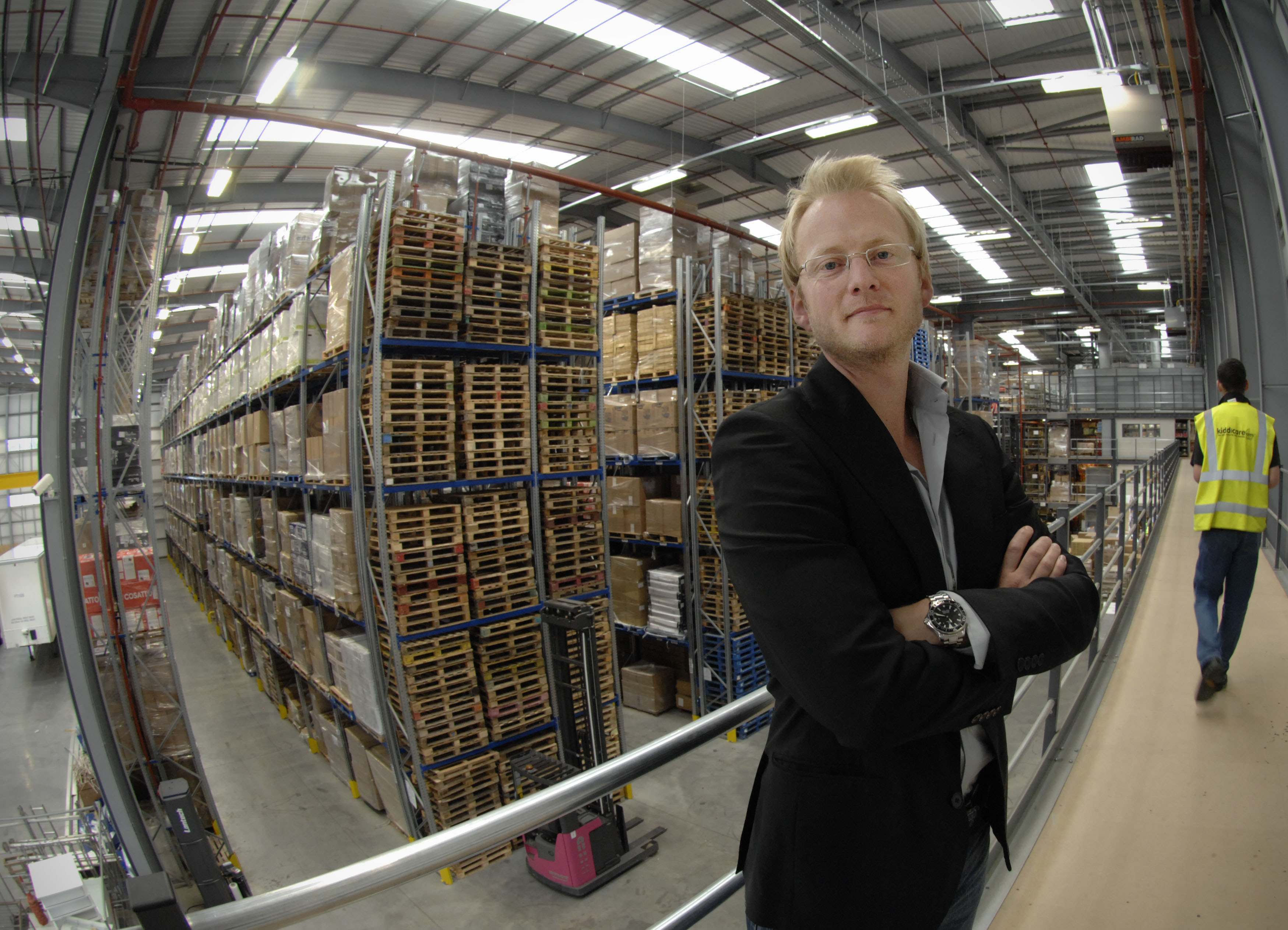 Scott Weavers-Wright, partner in Kiddicare, at the company's warehouse in Peterborough, Cambs. Ordered by Katie Carnie.
