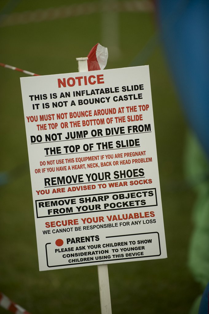 Mandatory Credit: ? Si Barber/07739 472 922 Health and safety sign on an inflatable slide