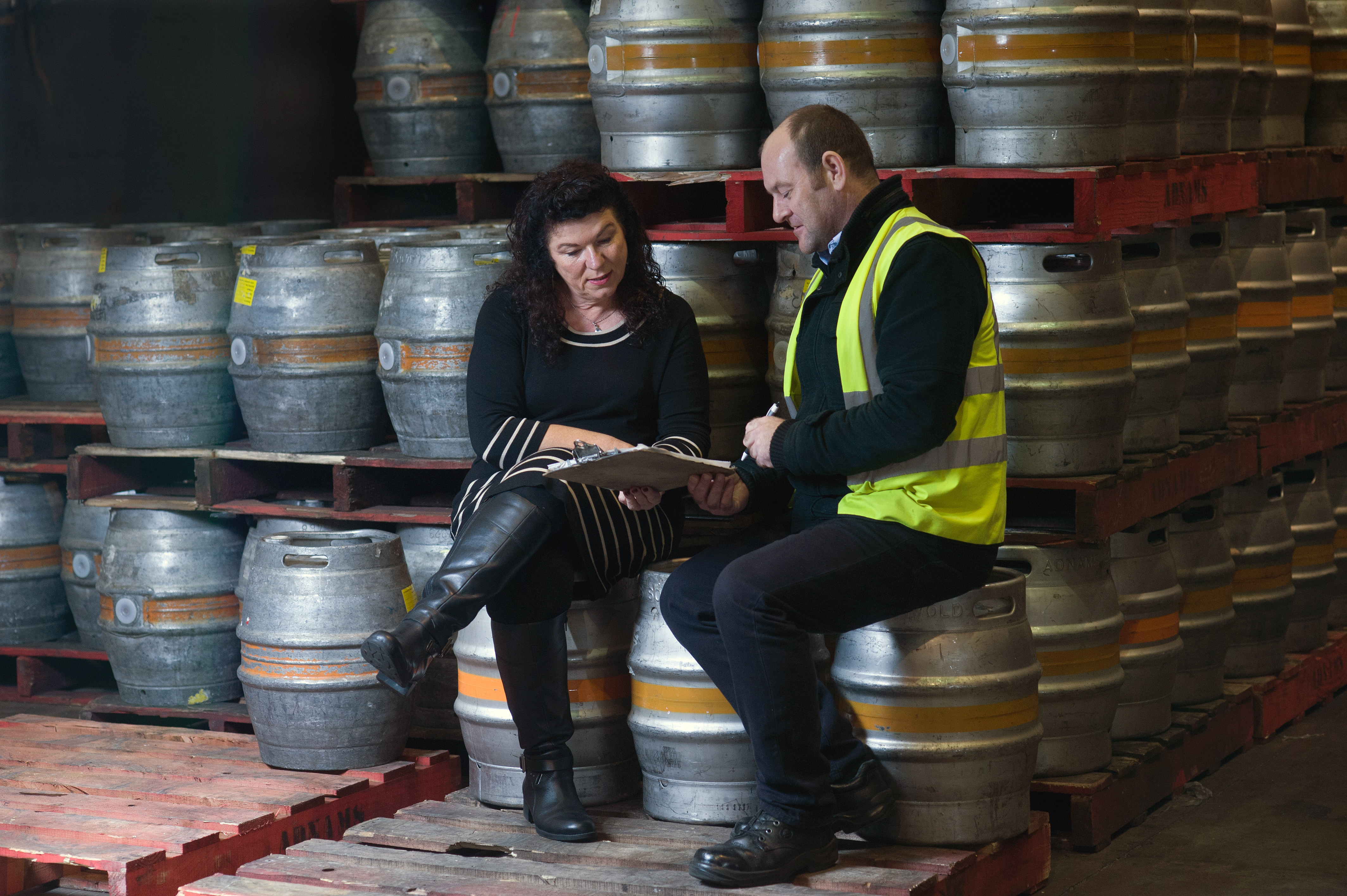 Karen Hester Director of Operations for Adnams Brewery at the distribution depot in Southwold, Sufolk. She is seen here with warehouse manager, Nathan Bartlett.