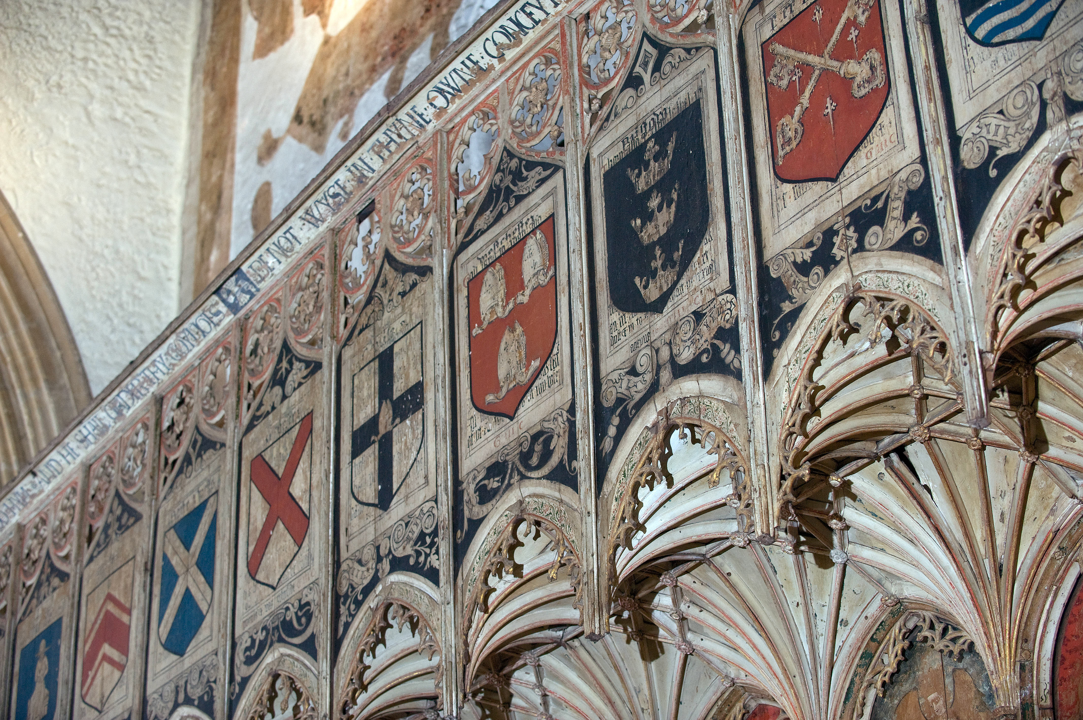 The rood screen and detail at St Mary's Church, Attleborough, Norfolk,UK. From the North (left) side, St John the Baptist , St John the Evangelist , the Blessed Virgin and Child. On the South side St Thomas of Canterbury, the Holy Trinity, and St Bartholomew. The church features a wall painting of the annunciation.
