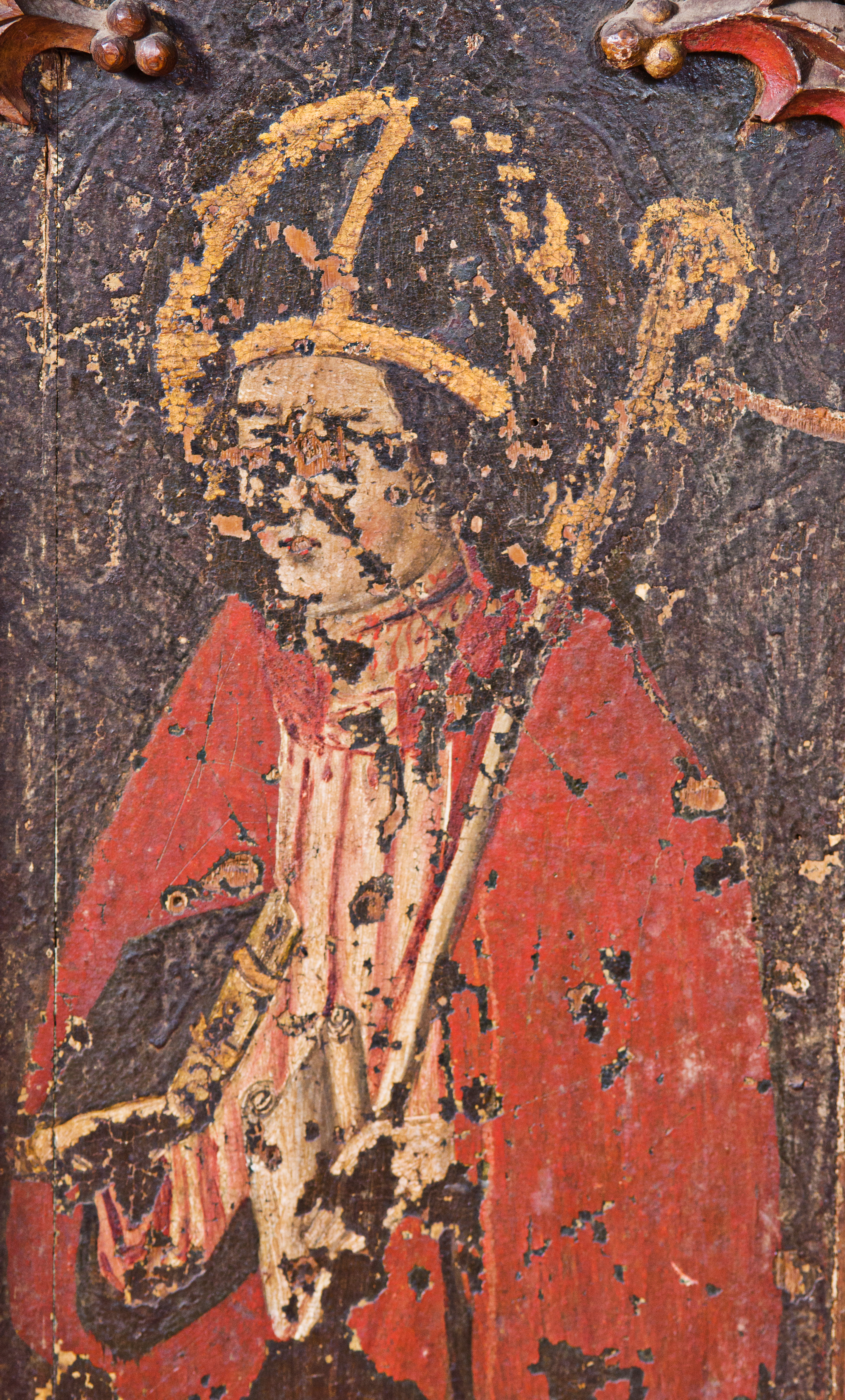 The rood screen and detail at St Nicholas' Church, Dersingham, Norfolk,UK. The figures depicted (l-r) are; St Apollonia, St Denys St Withburga,St Giles,St Juliana and St Cyprian.