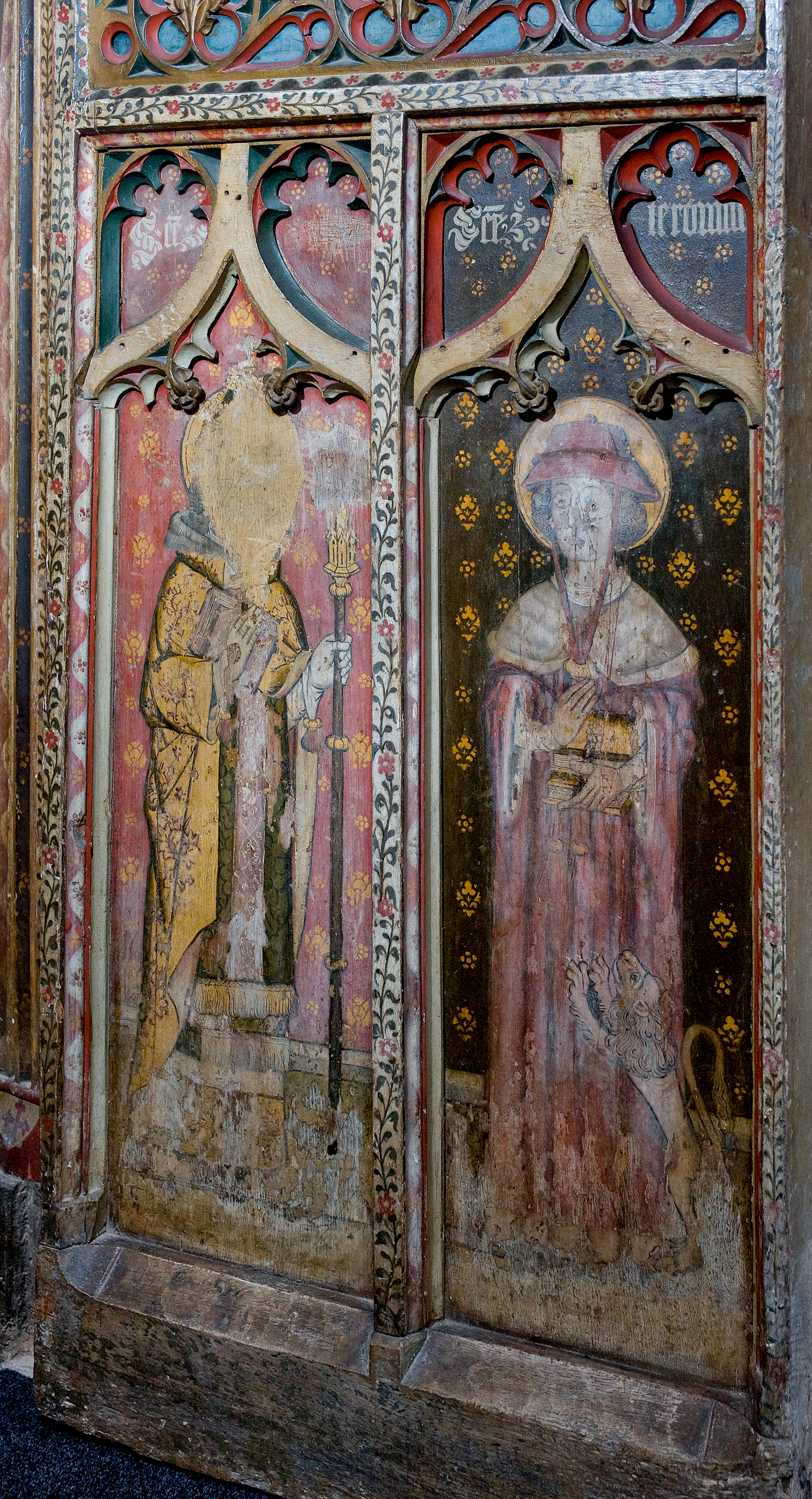 The Rood Screen and detail at St Agnes Church, Cawston, Norfolk. From the North (left) side the screens depict St Agnes , St Helena , St Thomas , St John , St James , St Andrew , St Paul, St Peter, . On the south side, St James, St Bartholomew , St Philip, St Jude, St Simon , St Matthew , St Matthias, Sir John Schorn.
