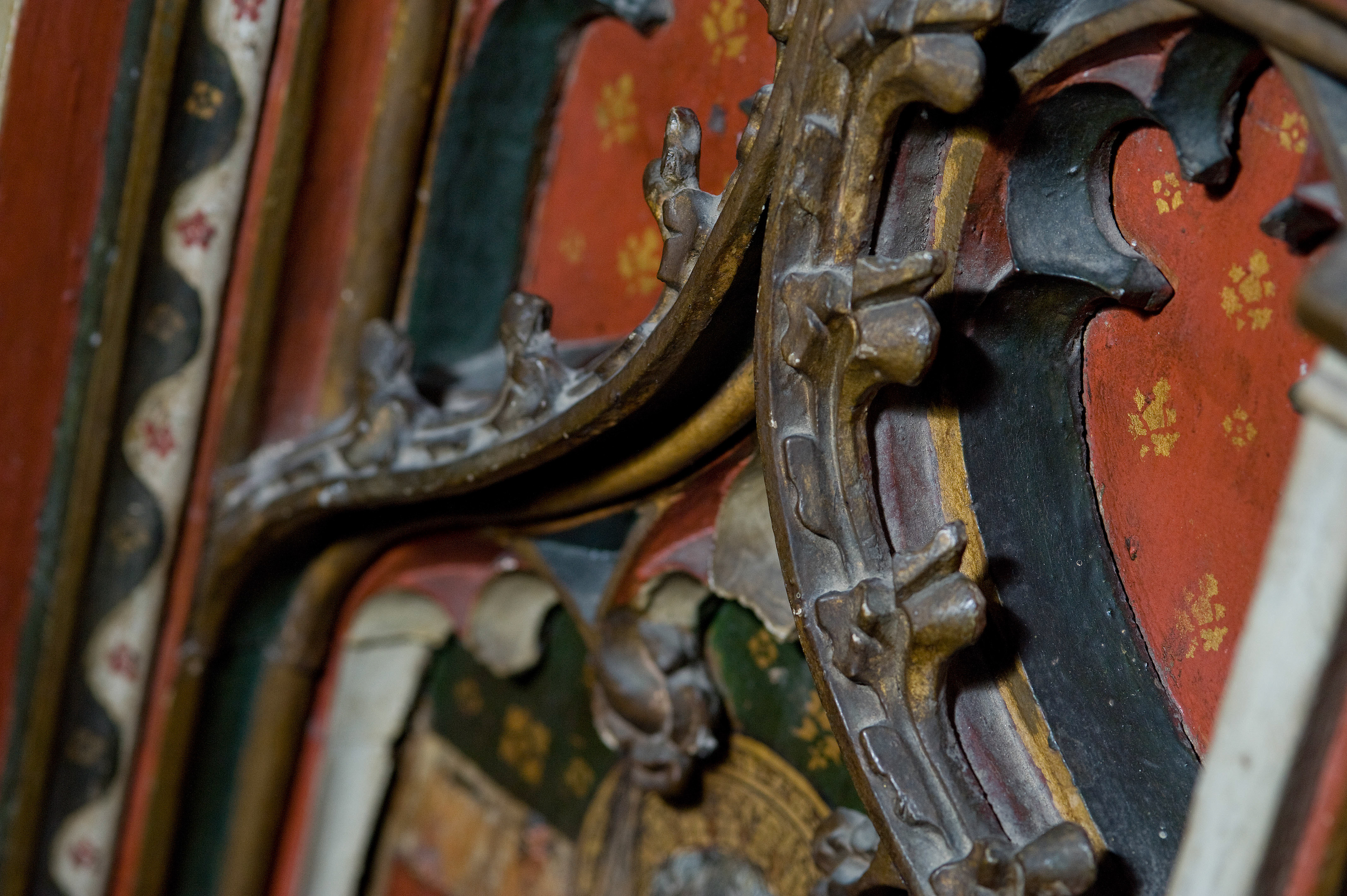 The Rood Screen and detail at St Agnes Church, Cawston, Norfolk. From the North (left) side the screens depict St Agnes , St Helena , St Thomas , St John , St James , St Andrew , St Paul, St Peter, . On the south side, St James, St Bartholomew , St Philip, St Jude, St Simon , St Matthew , St Matthias, Sir John Schorn.