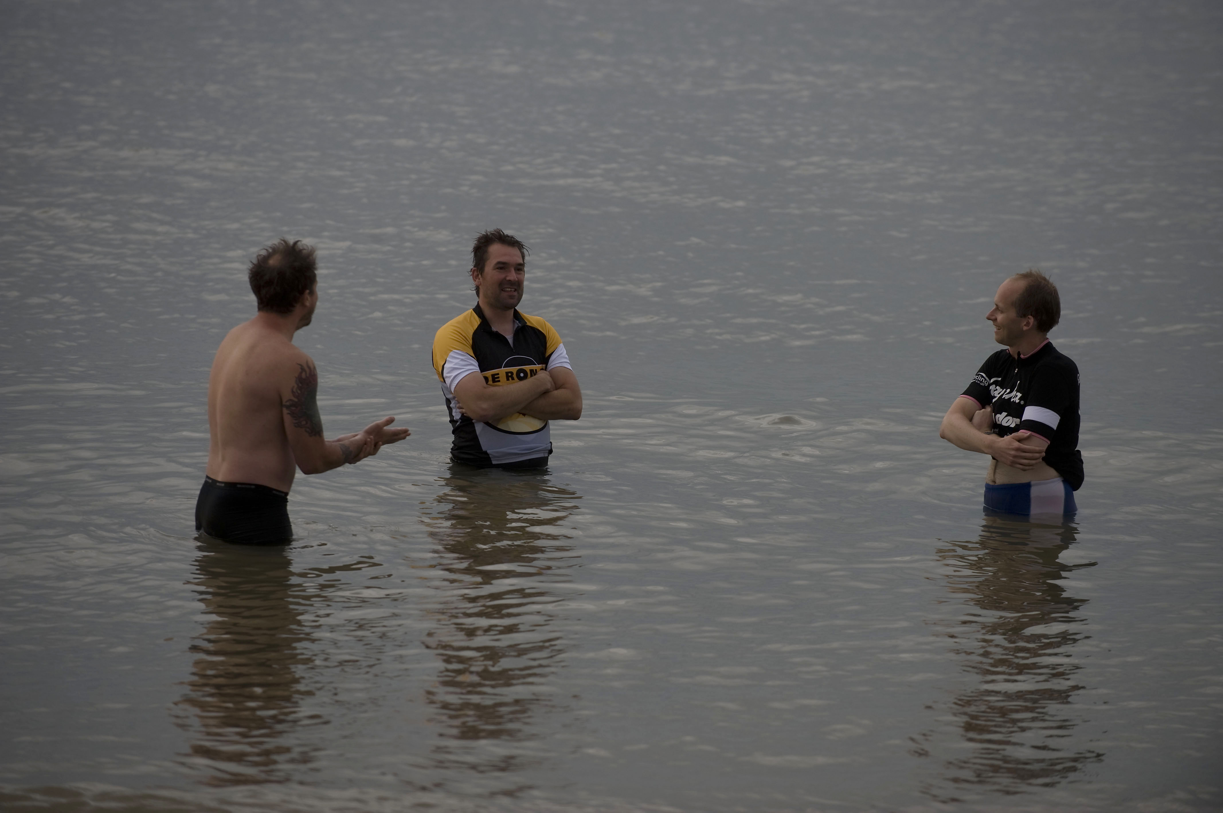 Si Barber 07739 472 922 Ordered by Leila Rawlins The Dunwich Dynamo cycle race in which competitors ride 120 mile route from London Fields to Dunwich in Suffolk overnight. Picture shows competitors cooling off in the sea at Dunwich after comleting the race.