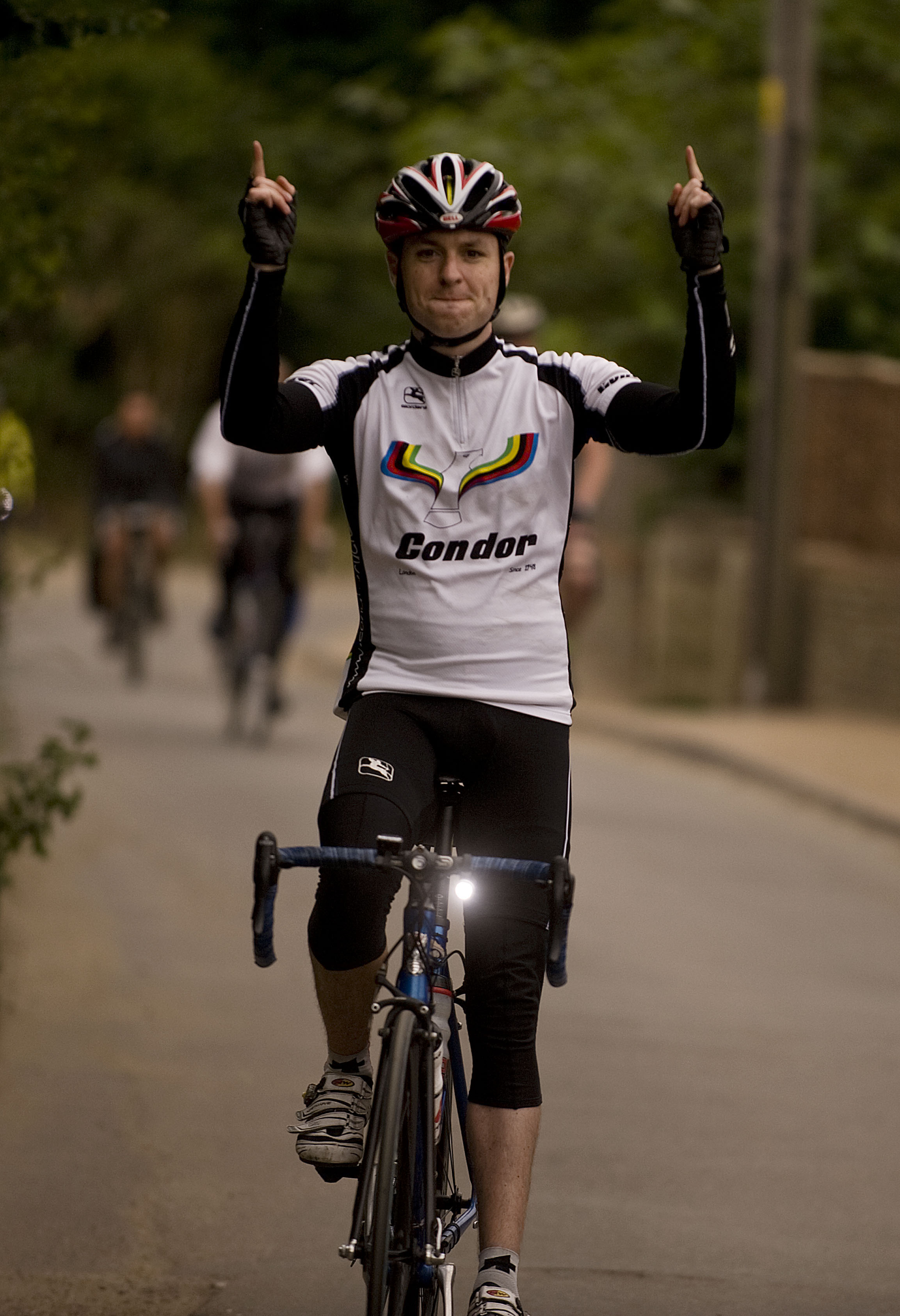 Si Barber 07739 472 922 Ordered by Leila Rawlins The Dunwich Dynamo cycle race in which competitors ride 120 mile route from London Fields to Dunwich in Suffolk overnight. Picture shows a competitor completing the race at Dunwich.