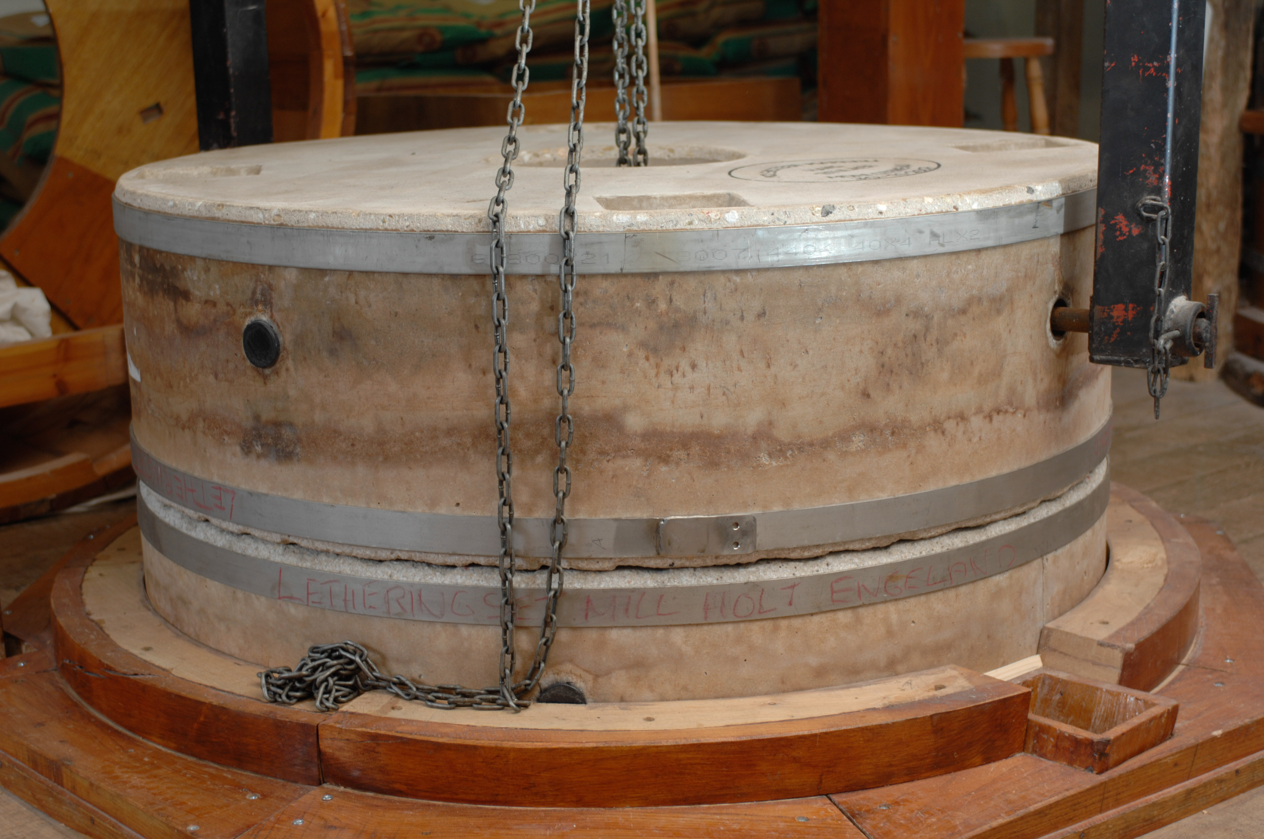 Letheringsett Watermill, in Norfolk which has been milling grain commercially since Medieval times. The mill has just installed two new grinding stones from Holland allowing them to double production. Pic shows millstones.