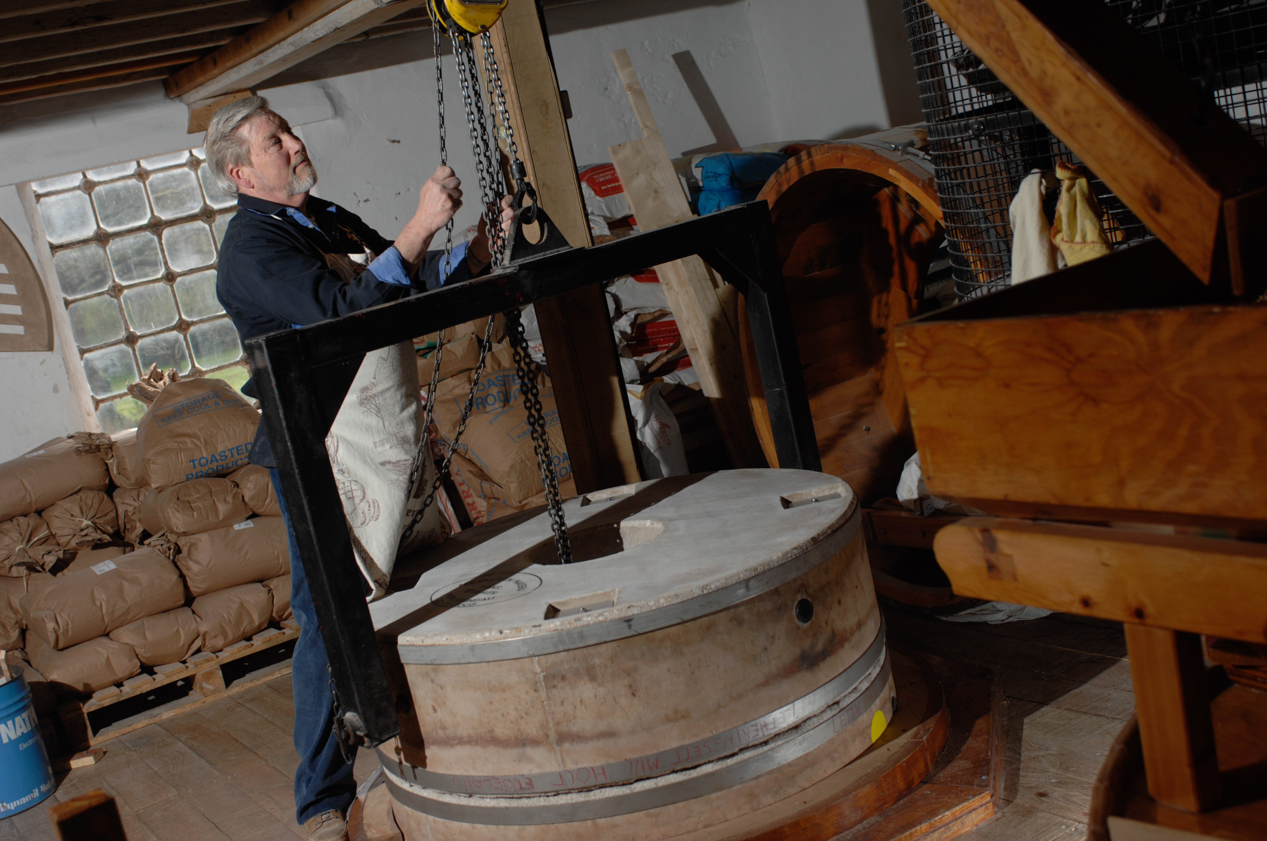 Letheringsett Watermill, in Norfolk which has been milling grain commercially since Medieval times. The mill has just installed two new grinding stones from Holland allowing them to double production. Pic shows owner Mike Thurlow making adjustments to the grinding stone.