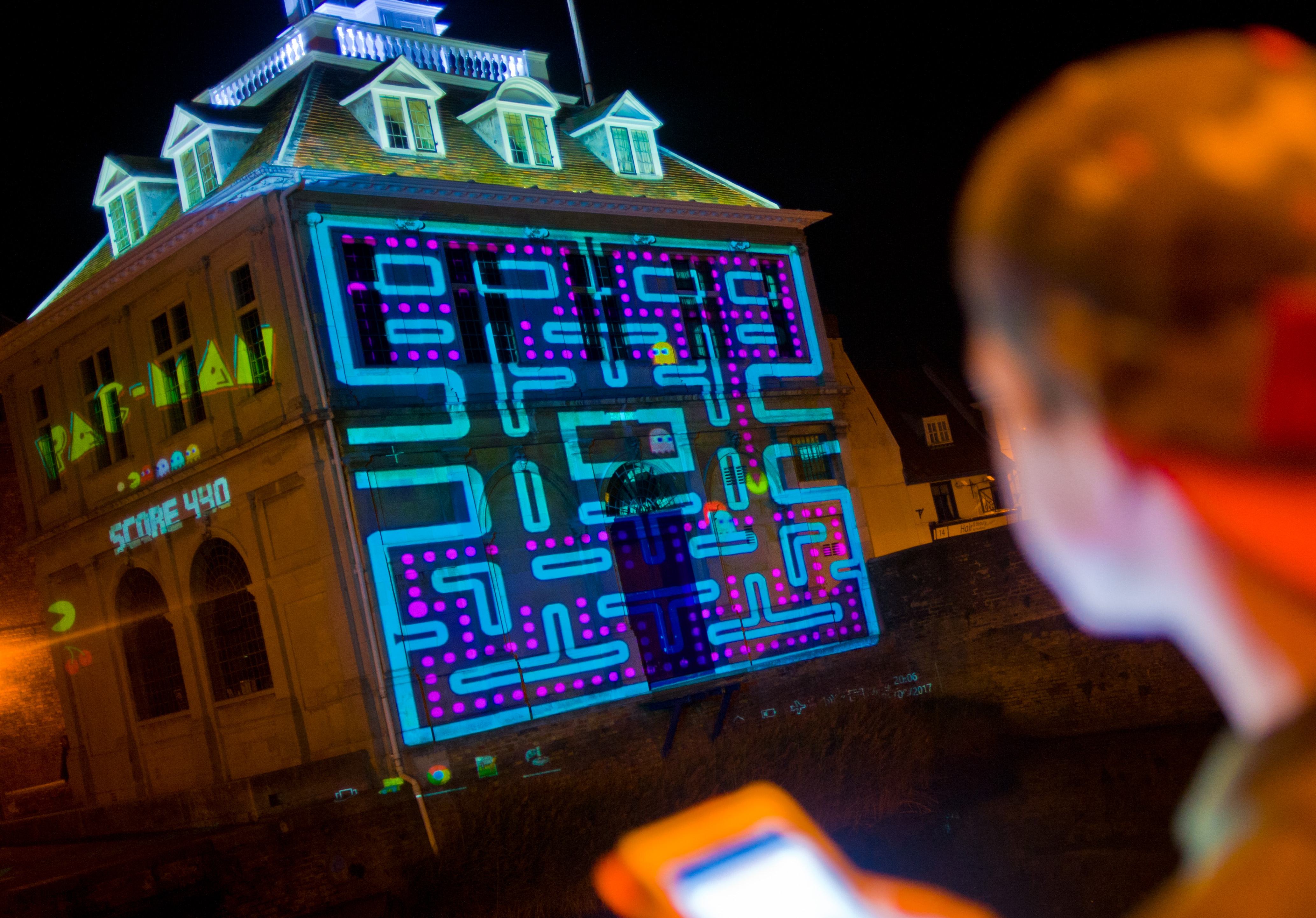 King's Lynn, UK, 29th Spetember 2017. Getting to grips with the world's largest PacMan game projected by art collective FishGills against the King's Lynn's custom house as part of an experimental art exhibition hosted by the town.