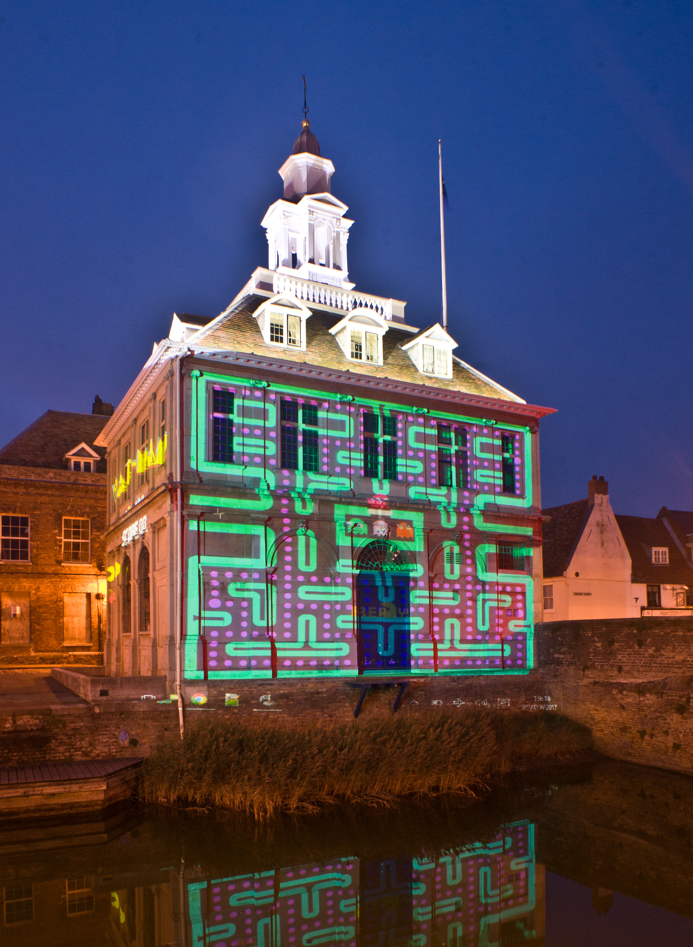 King's Lynn, UK, 29th Spetember 2017. Getting to grips with the world's largest PacMan game projected by art collective FishGills against the King's Lynn's custom house as part of an experimental art exhibition hosted by the town.