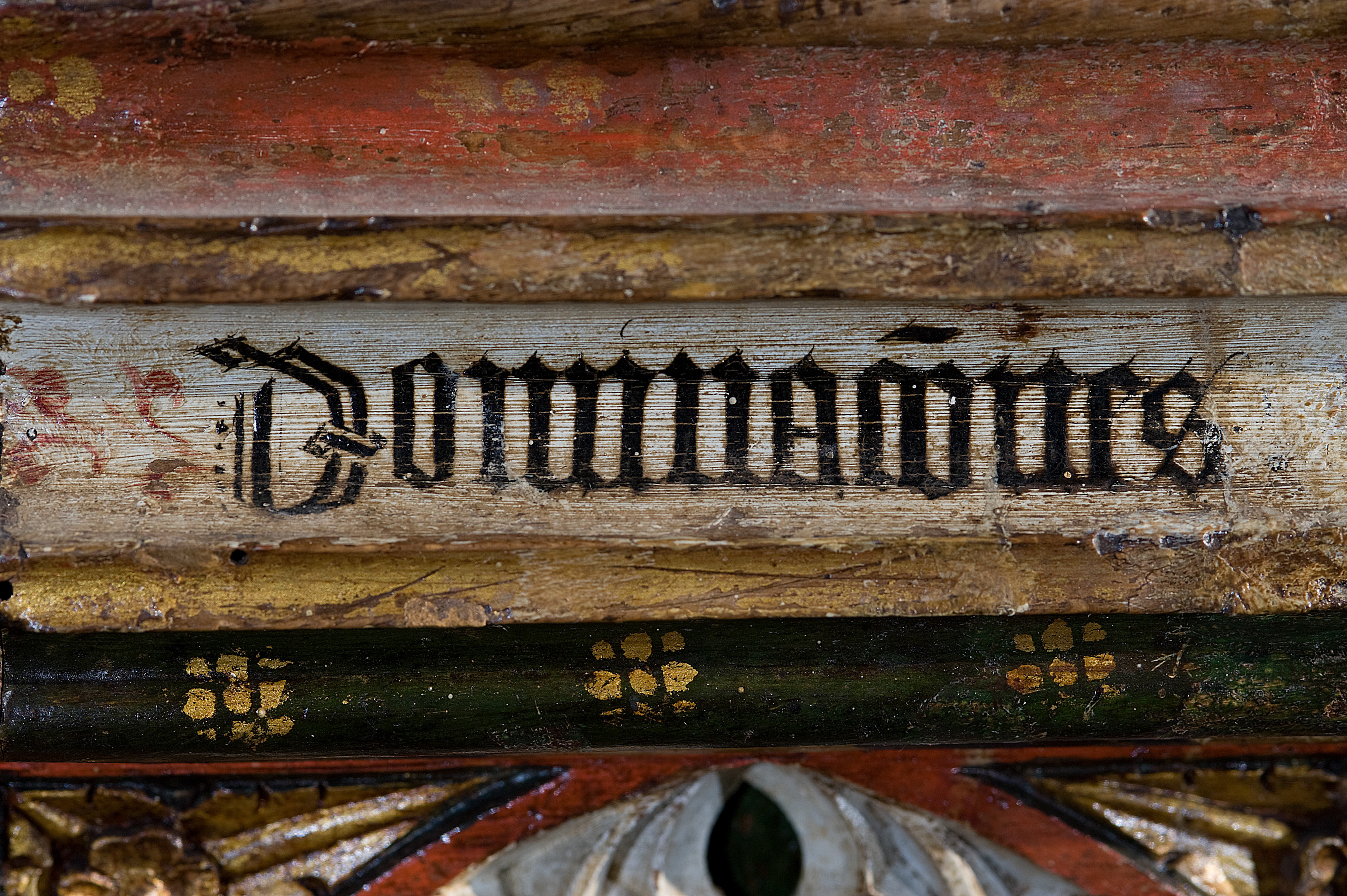 The rood screen and detail at St Michael, Barton Turf, Norfolk. The north (left) side features St Apollonia , St Sitha, then four of the hierarchy of angels Powers,Virtues, Dominations and Seraphim. On the South side Cherubim, Principalities, Thrones, Archangels and Angels, and St Barbara.