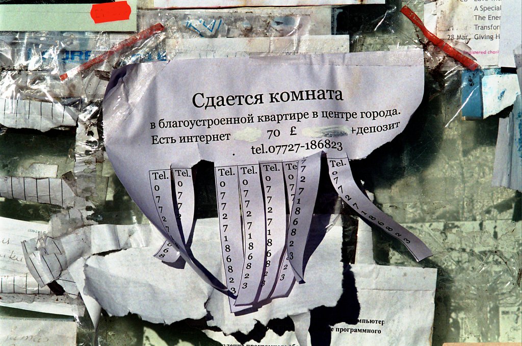 A room (kolhata) to rent advertisement in a newsagents window, King’s Lynn. The text is in Russian cyrillic and deliberately desig…