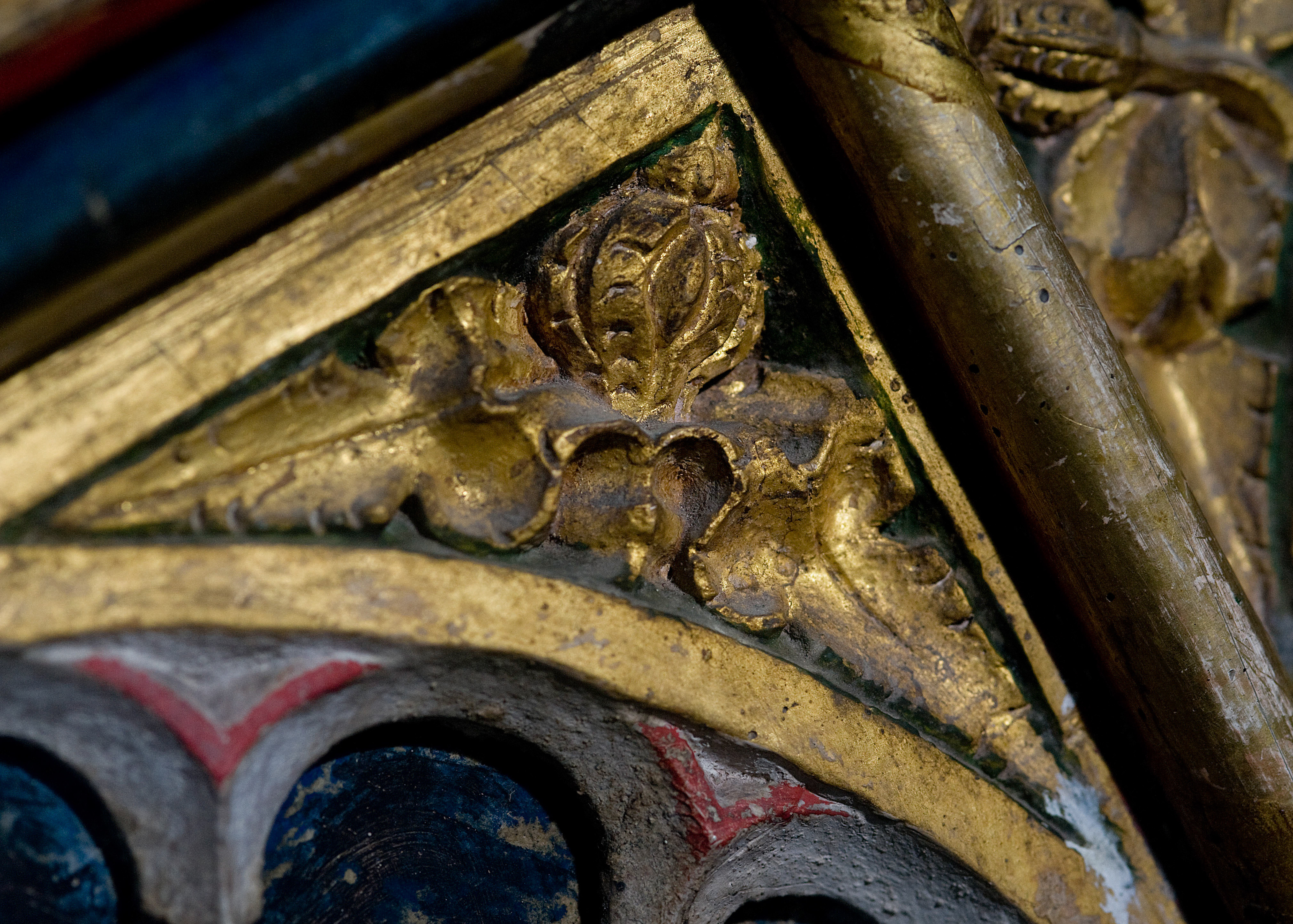 The rood screen and detail at the church of St Andrew, Bramfield, Suffolk. The surviving screens show Matthew, Mark, Luke and John, and St Mary Magdalene.
