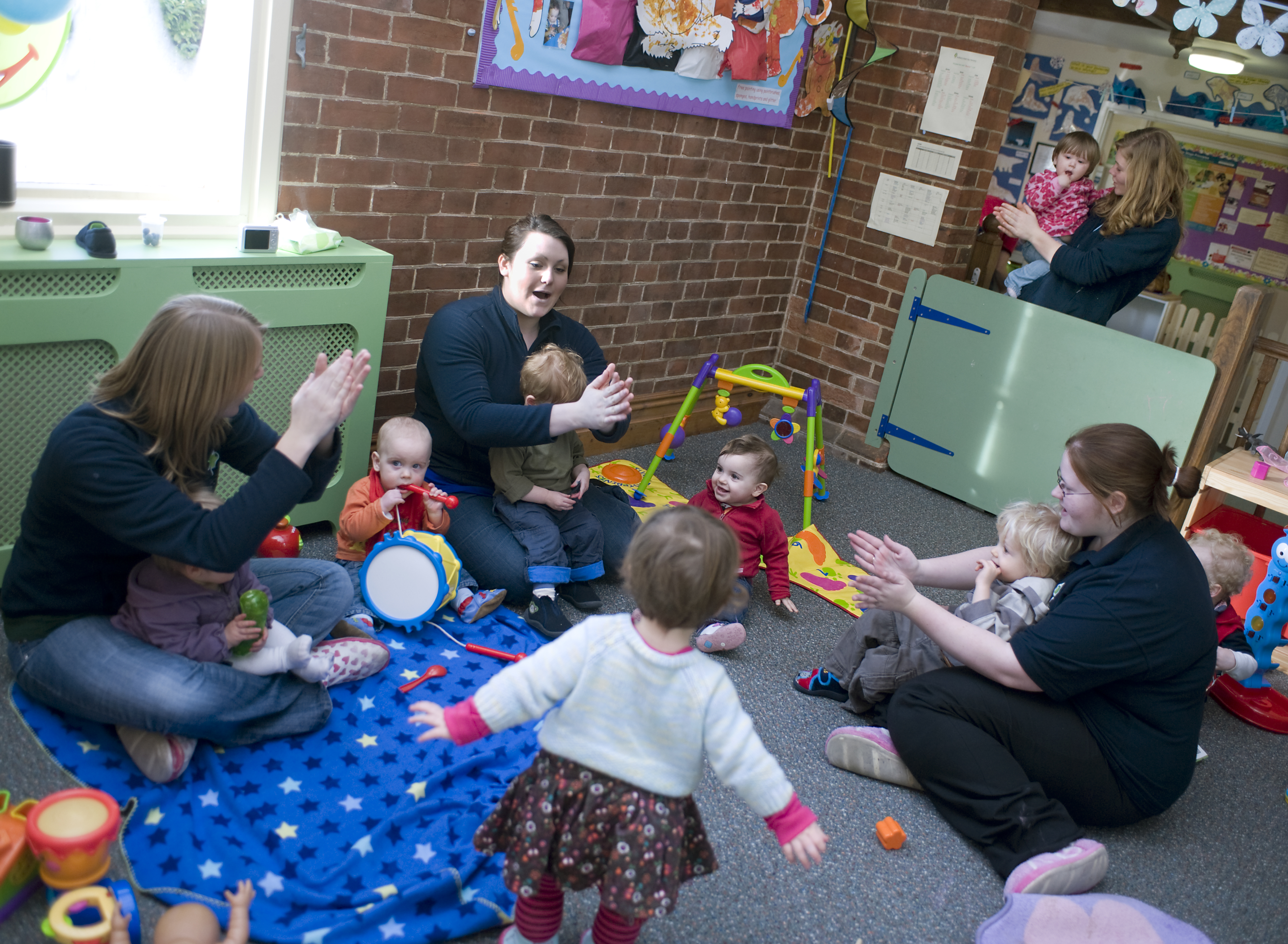 carers childminder children employees interaction kneeling nursery play sitting staff