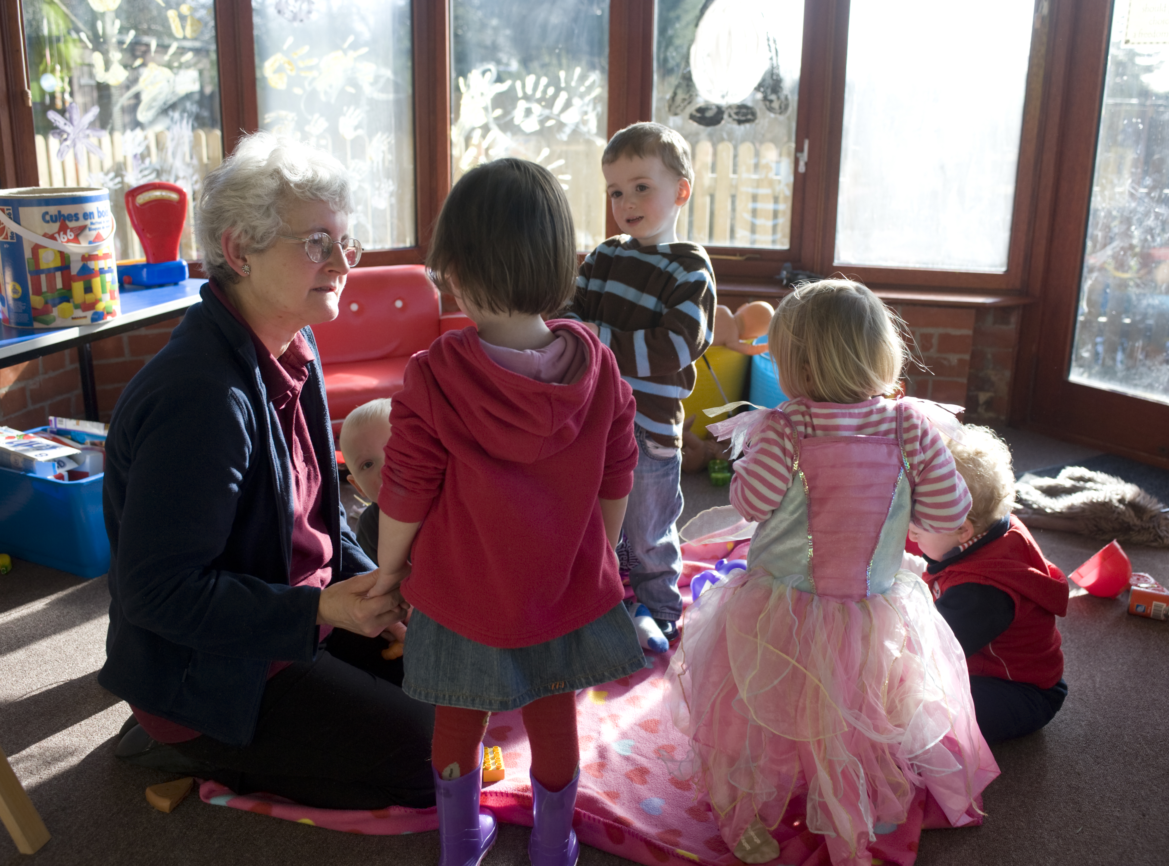 carers childminder children employees interaction kneeling nursery play sitting staff