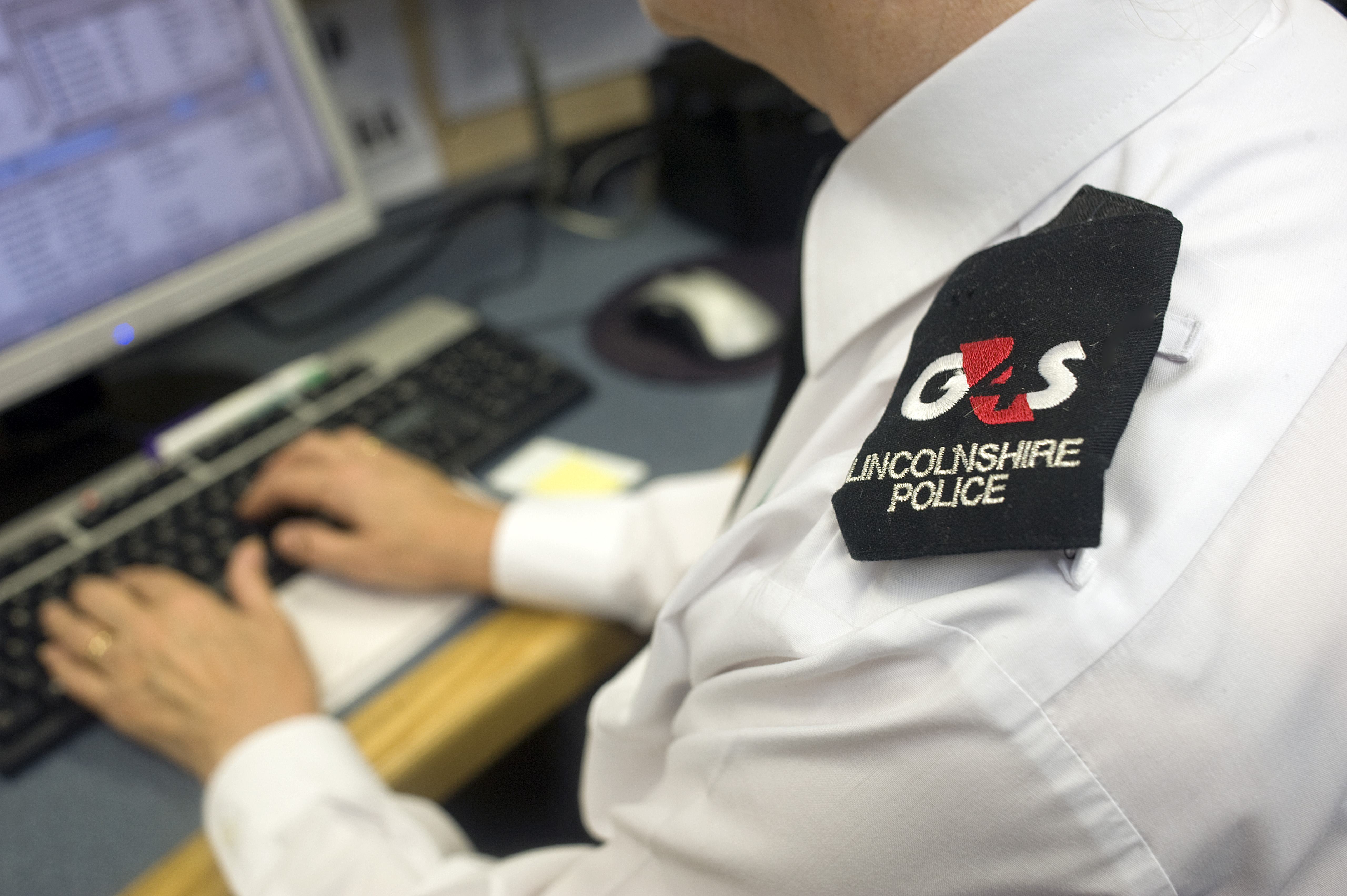 A police worker in Lincolnshire wearing an epaulette with the G4S logo. The public/private partnership, the first in the UK is thought to be a blueprint for other forces.
