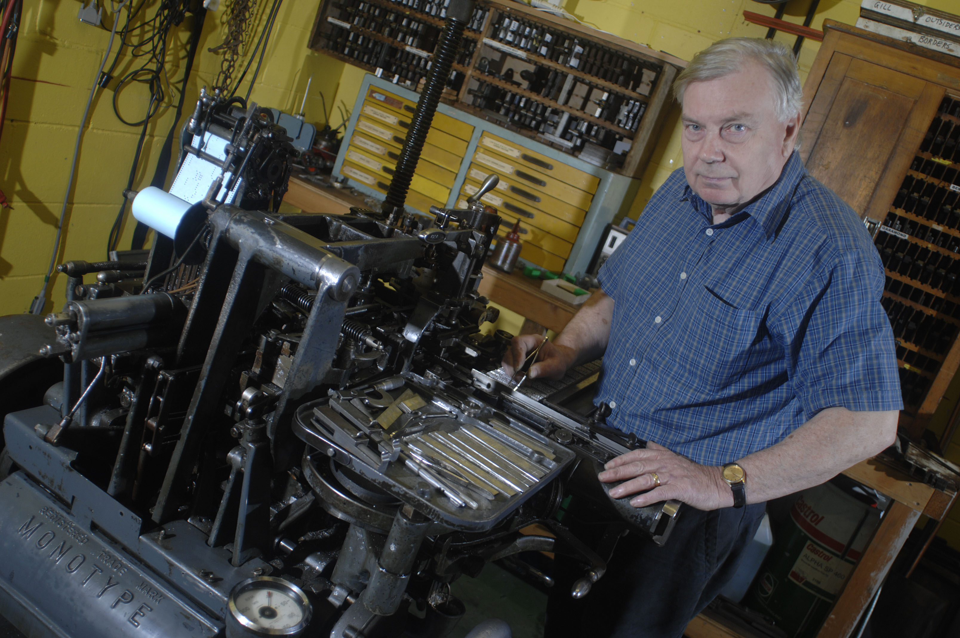 Pic by Si Barber - 07739 472 922 Traditional printer Brian Hubbard with 'hot metal' lead type, North Walsham, Norfolk.Ordered by Rebecca 171006
