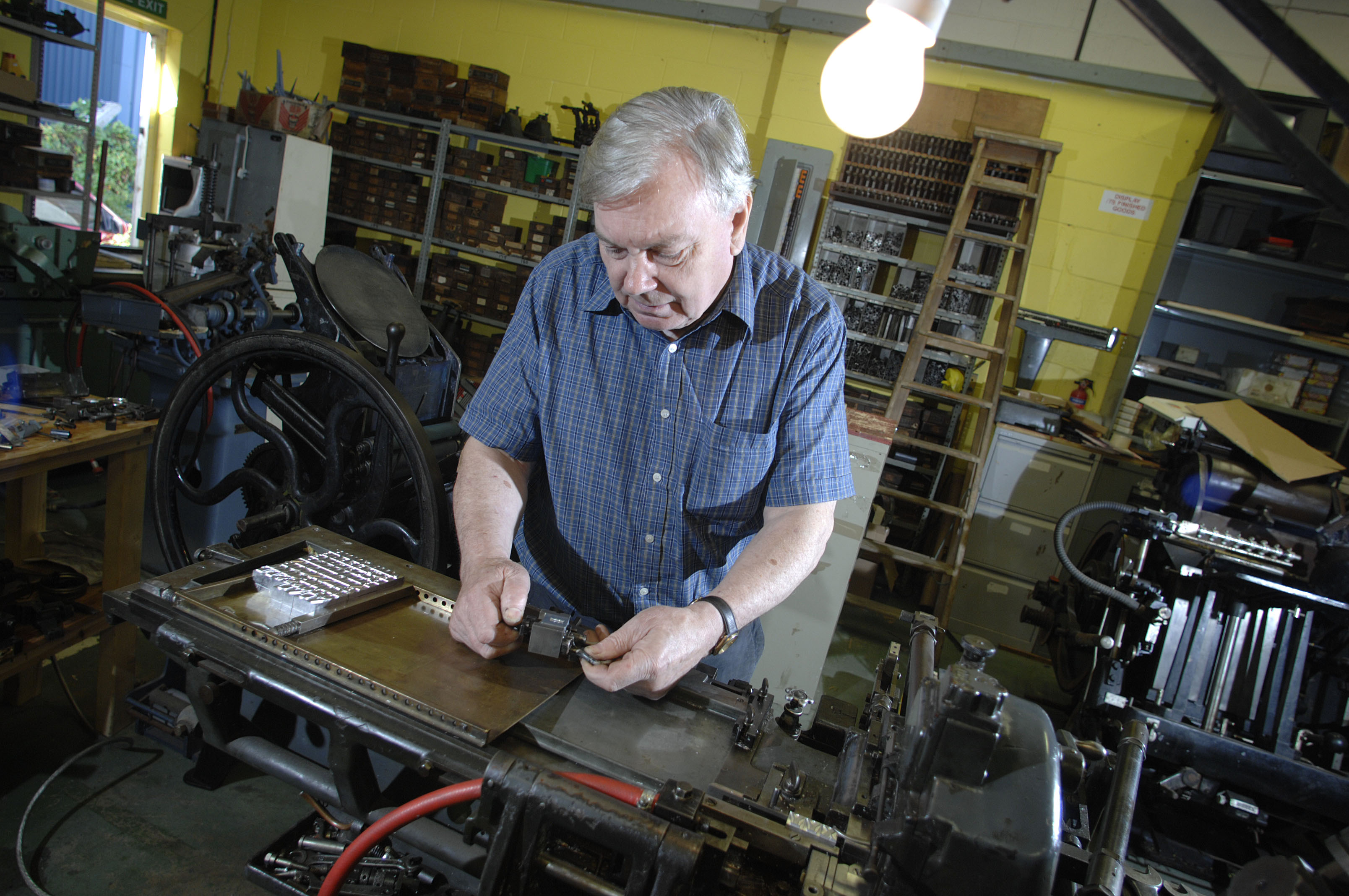 Pic by Si Barber - 07739 472 922 Traditional printer Brian Hubbard with 'hot metal' lead type, North Walsham, Norfolk.Ordered by Rebecca 171006