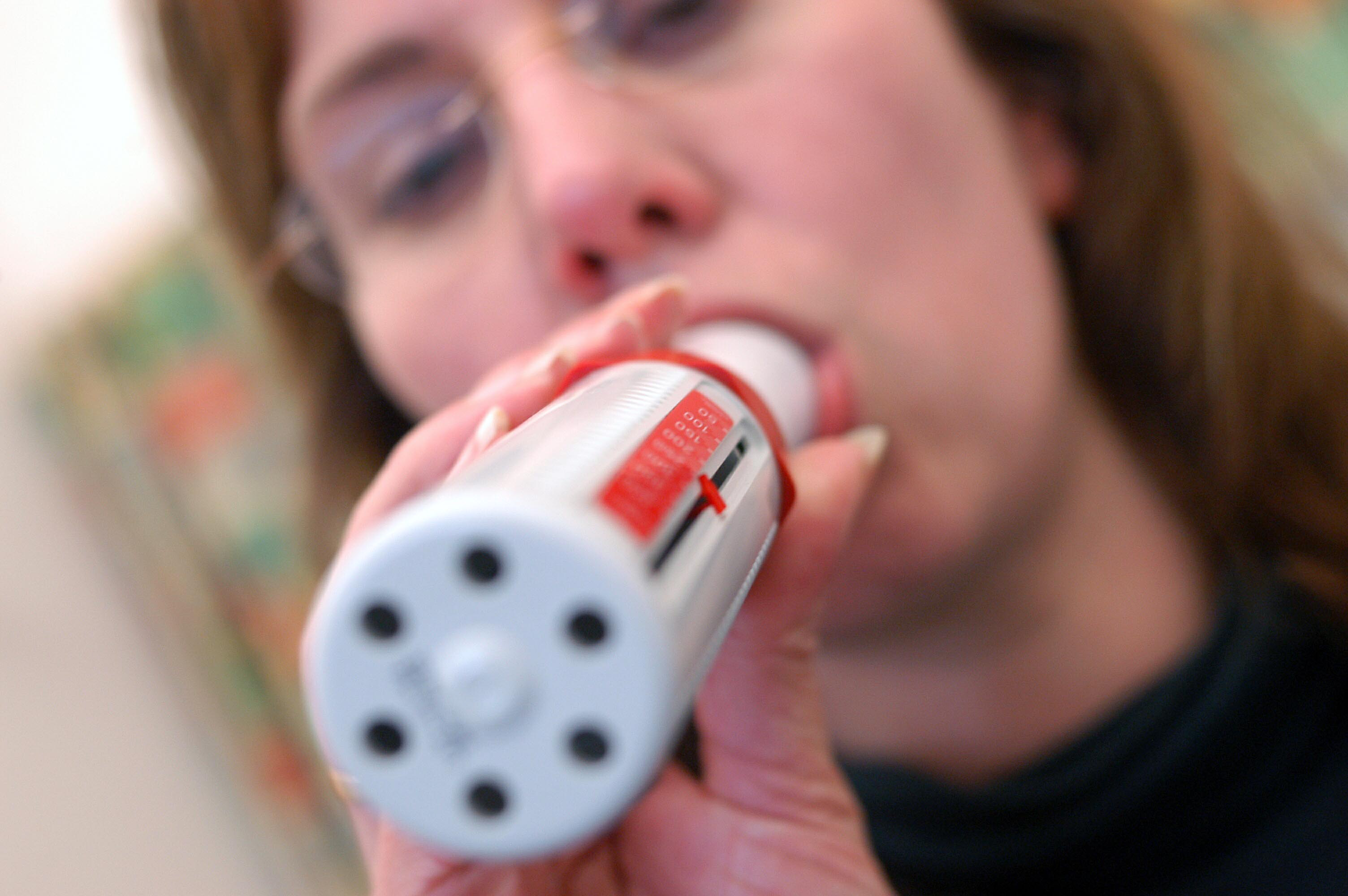 Patient Reg Hicks using a spirometer at and NHS GP's surgery.