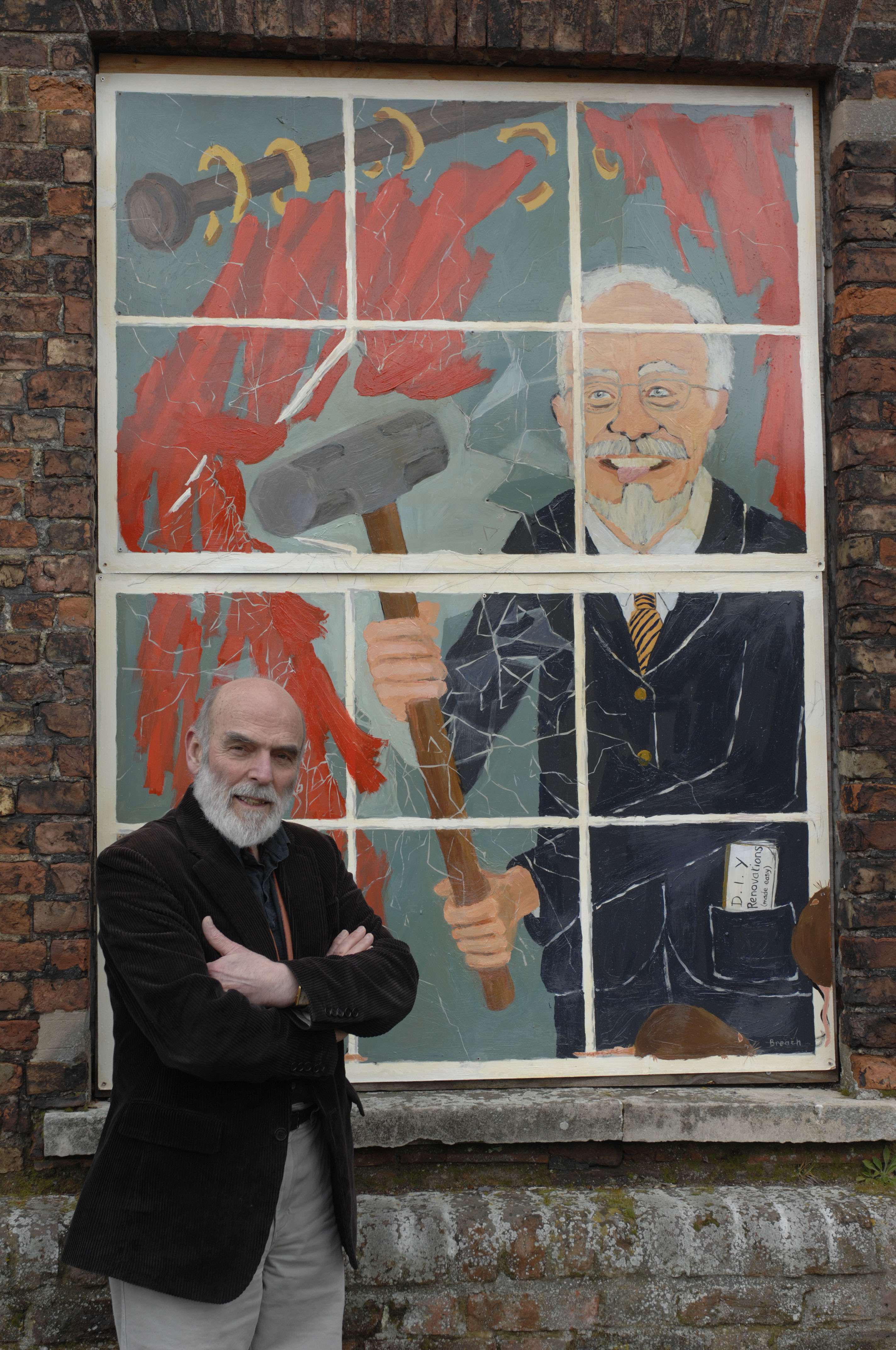 Guerilla conservationists in Kings Lynn erecting art work to improve the facade of Purfleet House which is said to be owned by developer Roger Gawn. The property has been the centre of a dispute which has seen conservationists petitioning the owner to repair the property.
