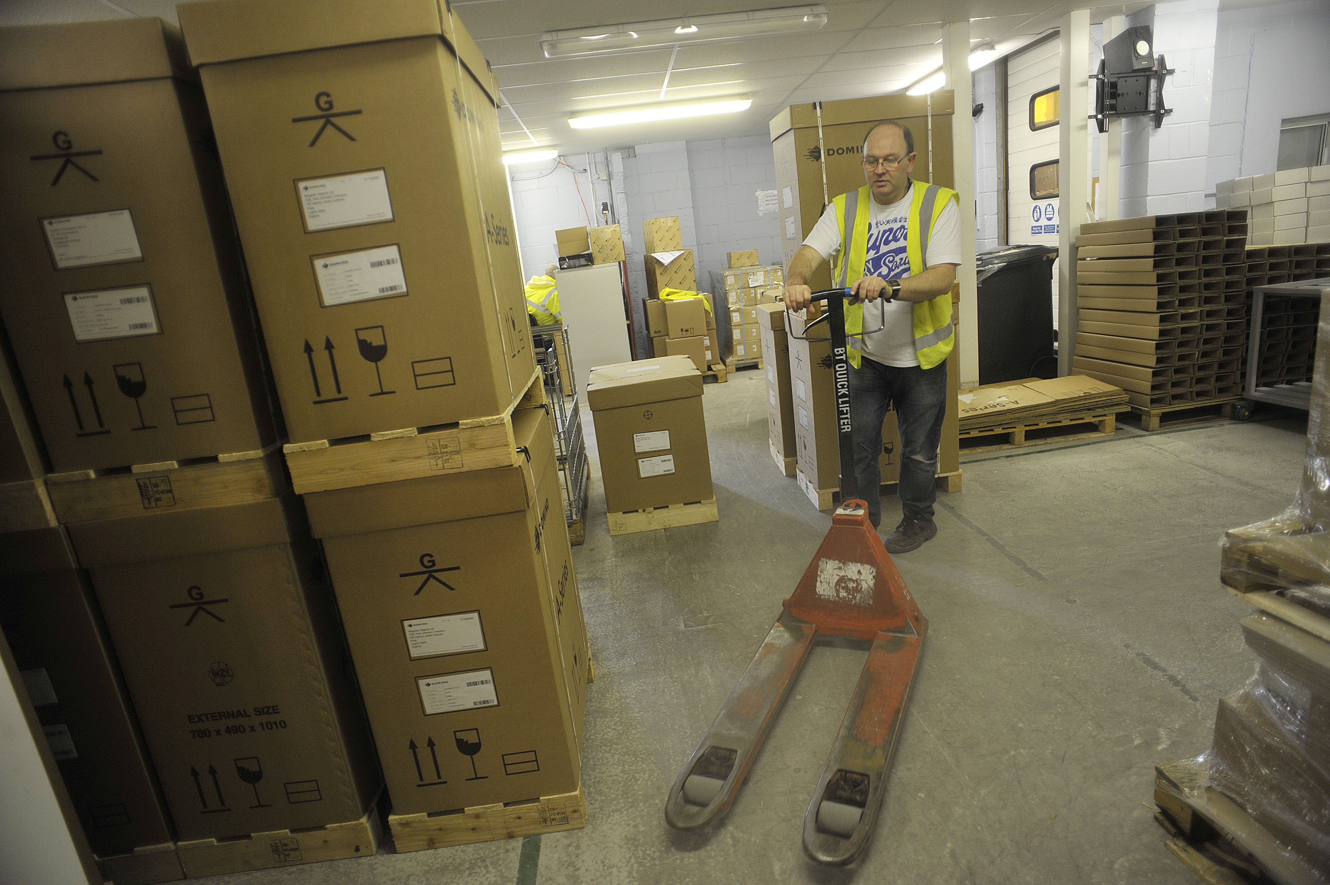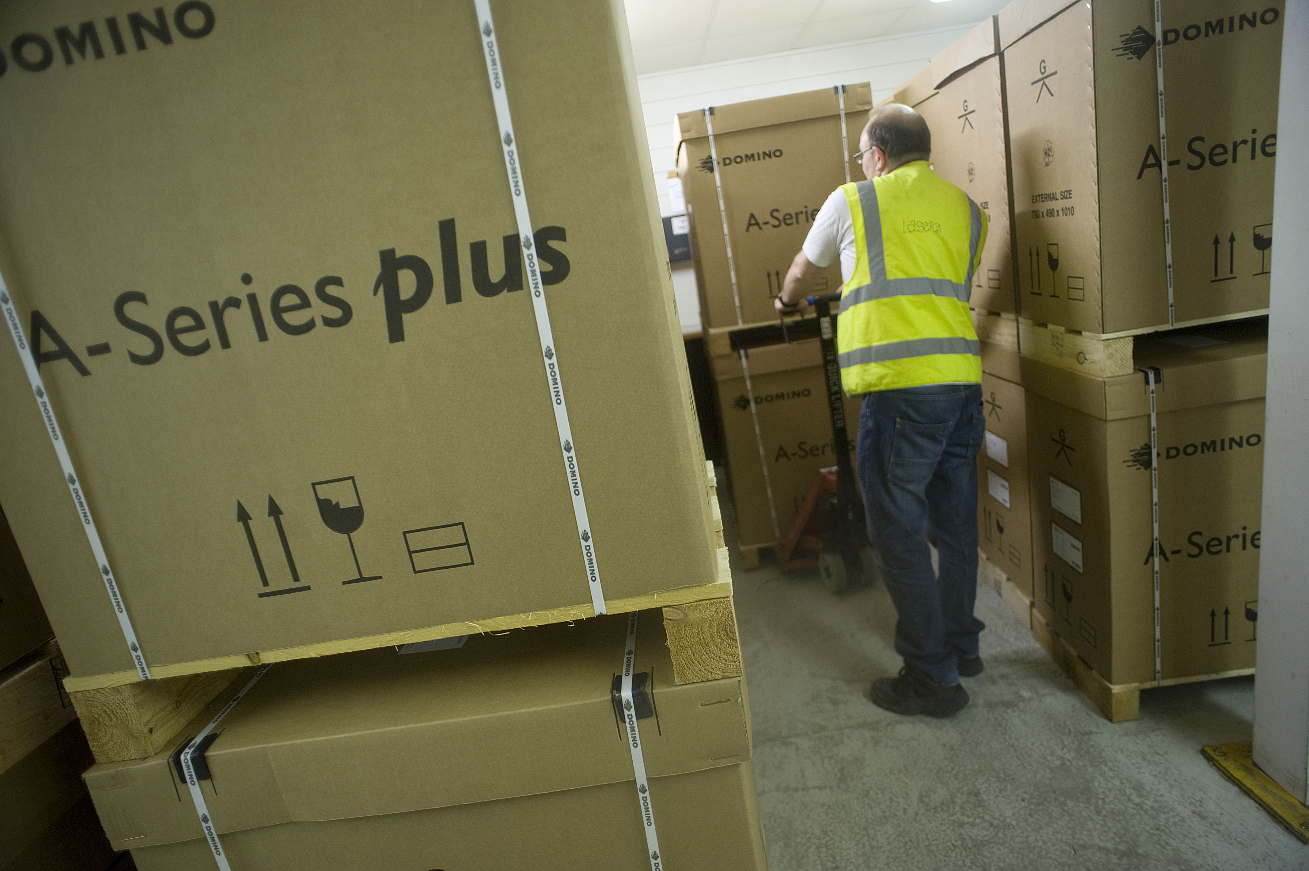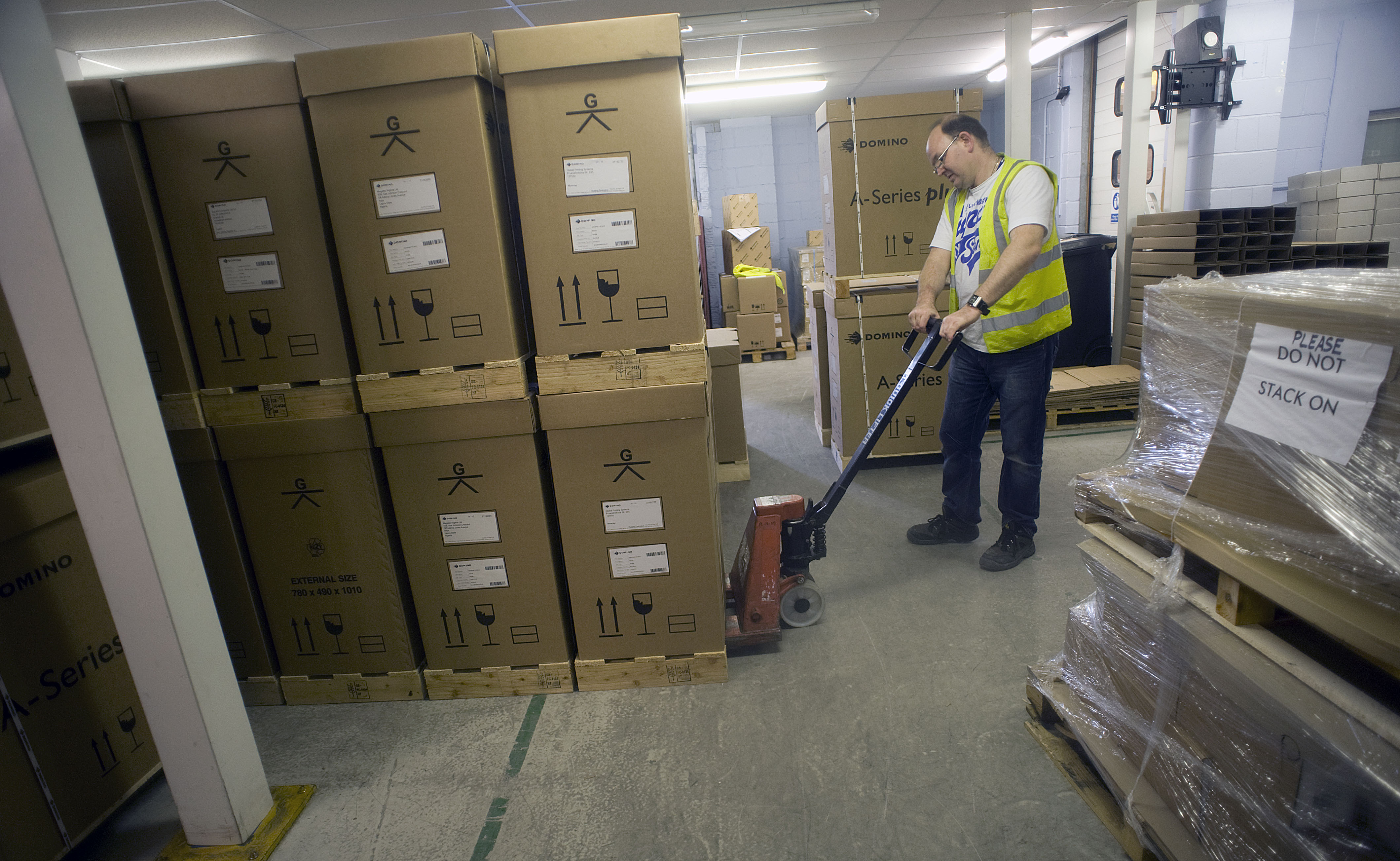 Domino Printing factory floor. Images shows: Boxed printers awaiting distribution.