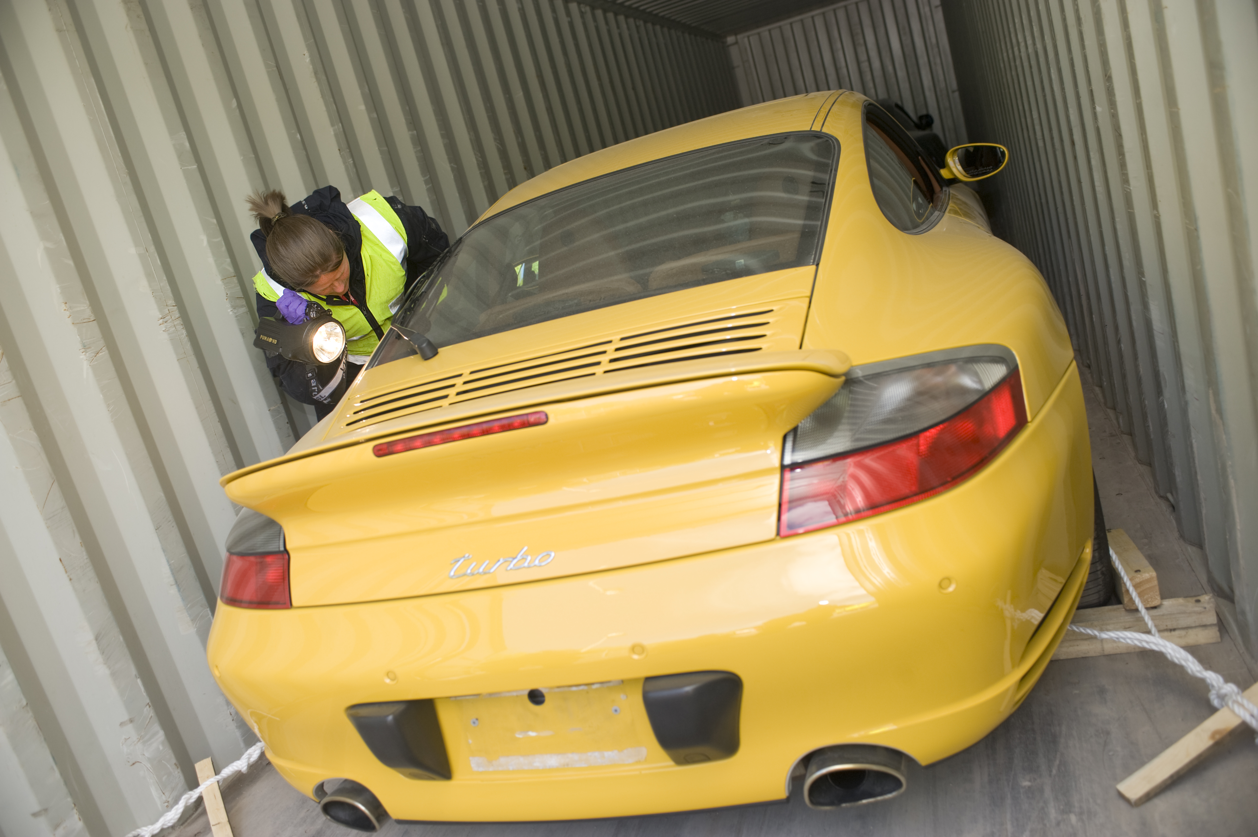 Police officers searching containers at Felixstowe port in Suffolk for stolen goods and contraband.