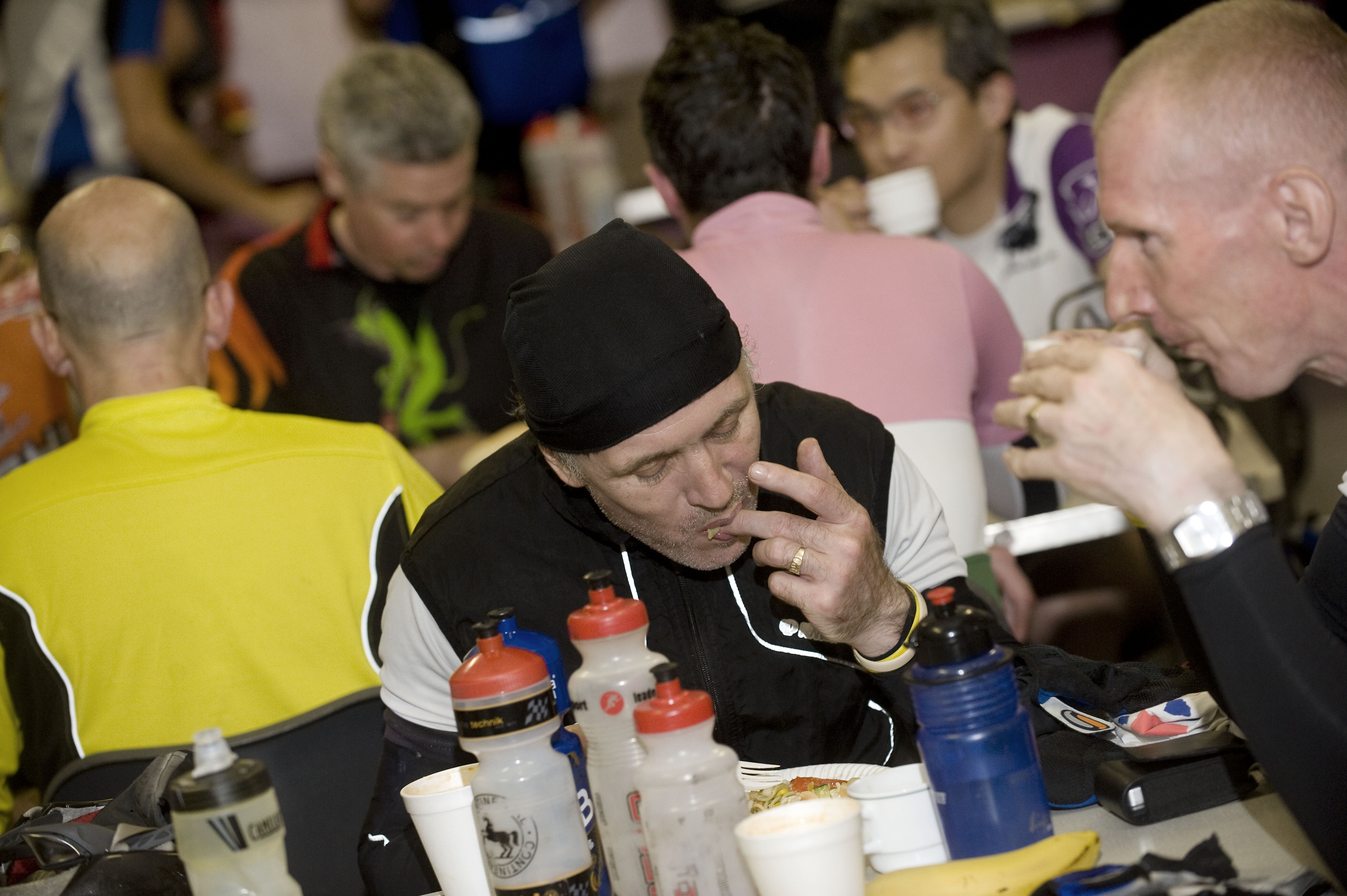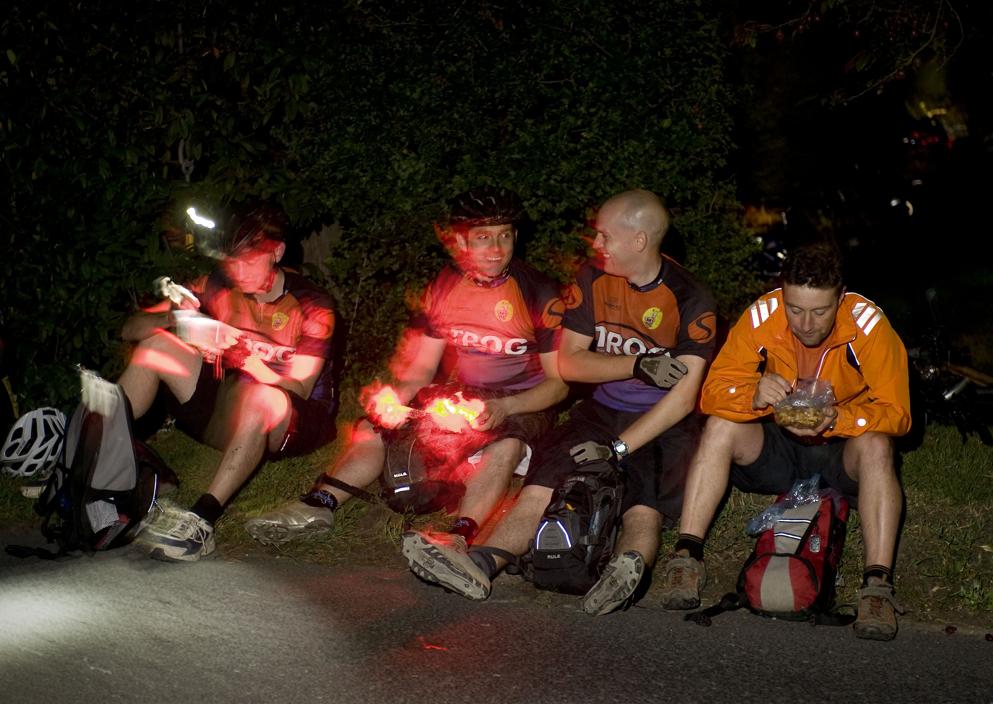 Si Barber 07739 472 922 Ordered by Leila Rawlins The Dunwich Dynamo cycle race in which competitors ride 120 mile route from London Fields to Dunwich in Suffolk overnight. Picture shows riders taking a break to take on some food.