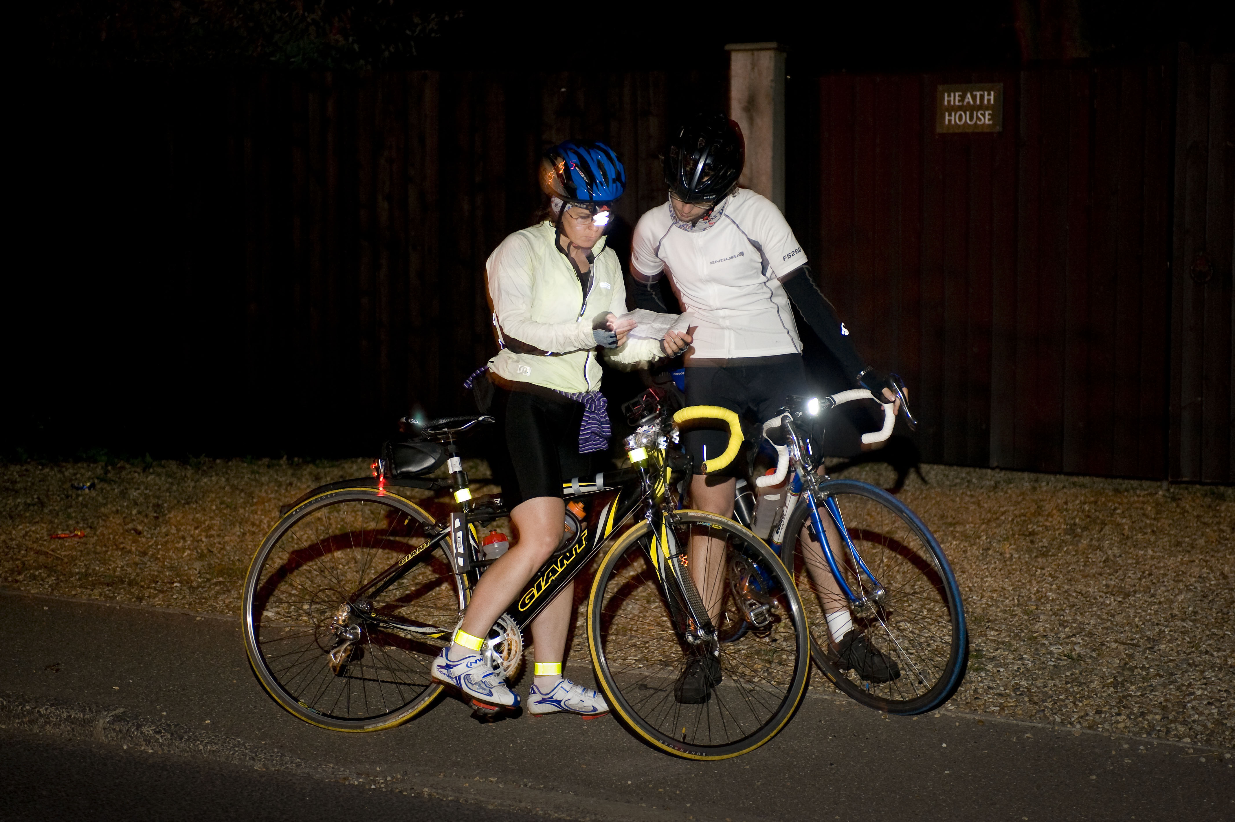 Si Barber 07739 472 922 Ordered by Leila Rawlins The Dunwich Dynamo cycle race in which competitors ride 120 mile route from London Fields to Dunwich in Suffolk overnight. Picture shows cyclists correcting their navigation after taking a wrong turn.