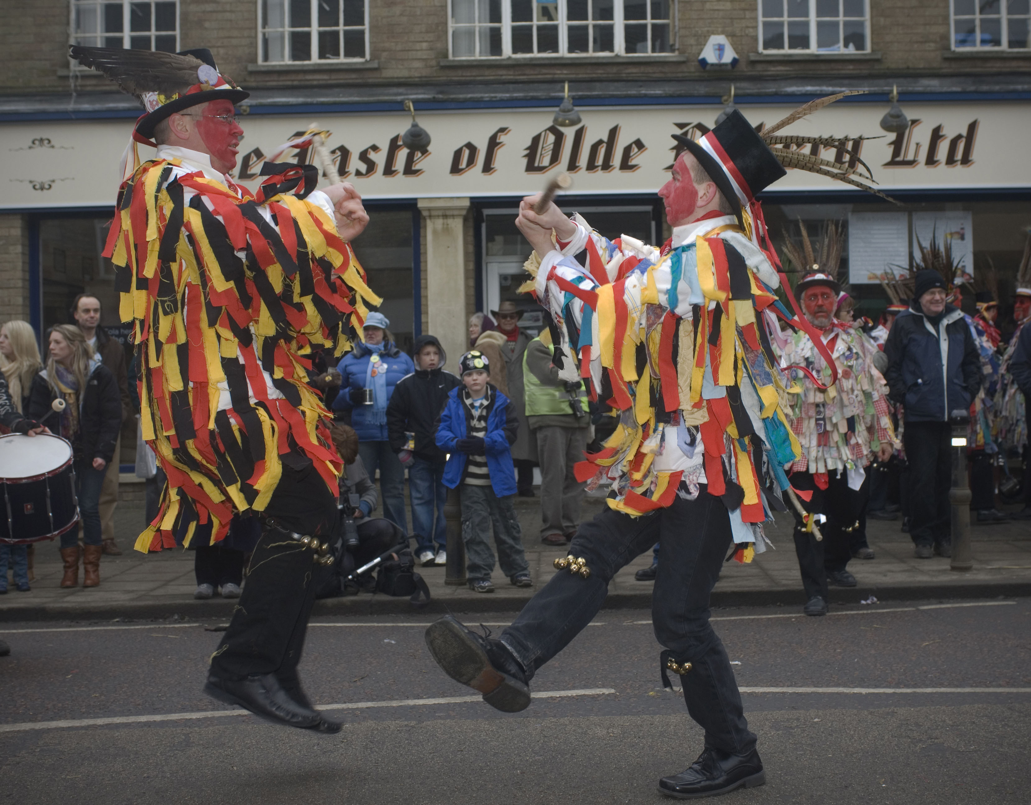 Molly dancers at the Straw Bear festival, Whittlesea, Cambs. The festival is a revival of a centuries old tradition when it is thought unemployed agricultural labourers dressed up in rags and came into the villages to entertain the population for money. Forbidden by law in the early 20th Century, the highlight of the event is when the straw 'bear' who is paraded through the town by his keeper and then set on fire in a nearby field. The modern event attracts Morris and Molly dancer from across the county.